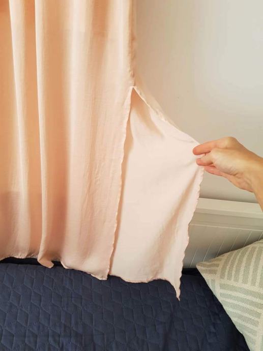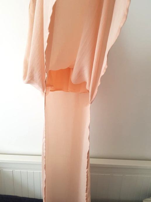 Haljina ima dugački prorez sa svake strane pri dnu i podstavu do iznad koljena.