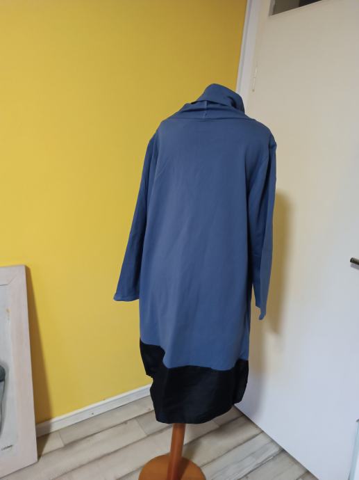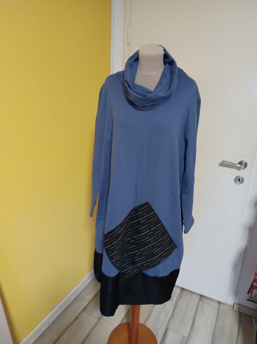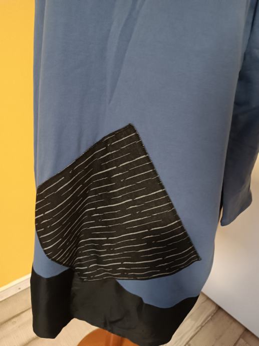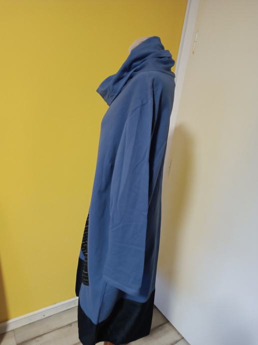 Plava haljina s crno-bijelom prugastim uzorkom. Spoj elegancije i udobnosti. Velika dolčevita. Nosi se široko.