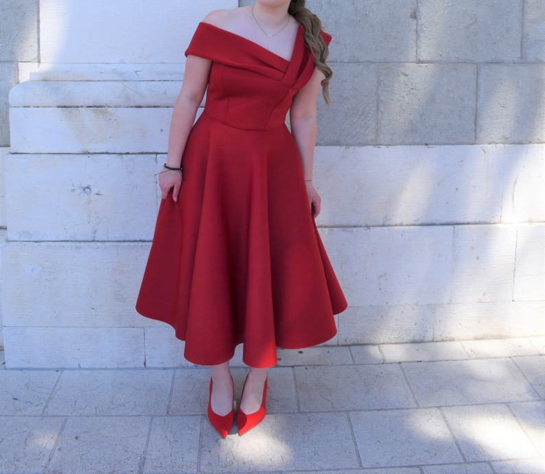 Kroj: Moderan off-shoulder gornji dio koji prati liniju tijela i bogata suknja A-kroja.