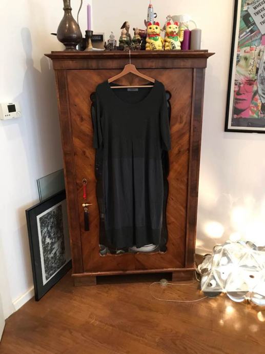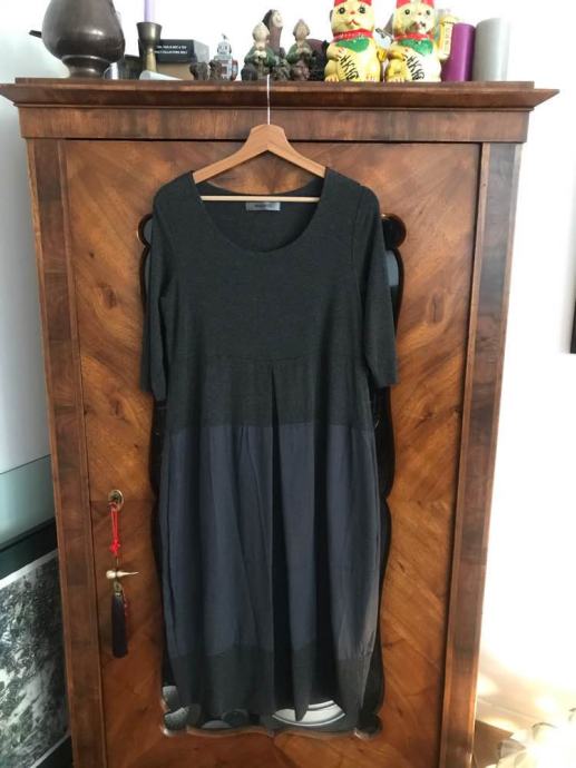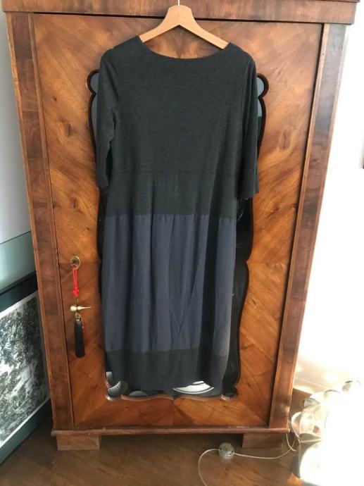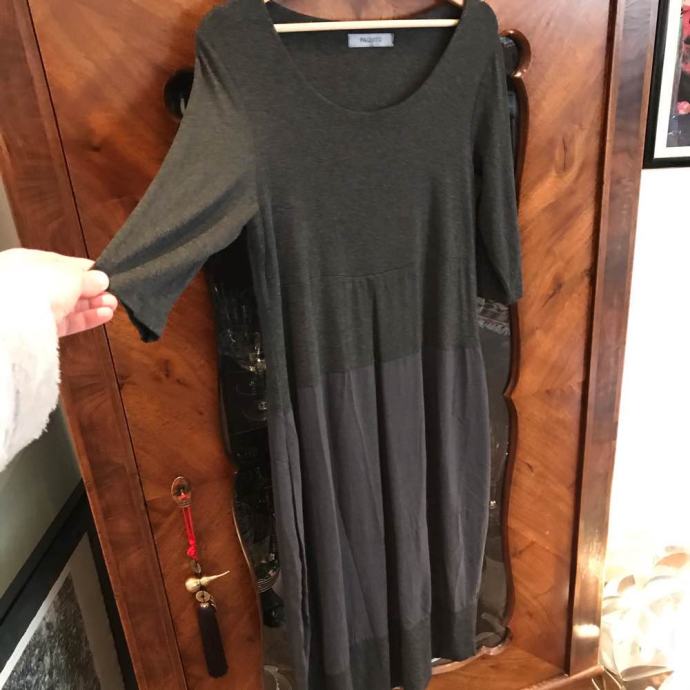 Potpuno nova haljina, sasivena od dvije vrste materijala, sive boje. Donji dio sivan u ‘balon’ oblik. Brand Paquito, talijanski XL broj, hrvatski 42. Materijal 95% viskoza, 5% elastan. Odlicna haljina za proljece, nosiva u raznim kombinacijama i stilovima.