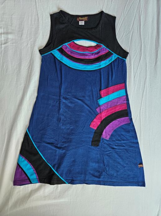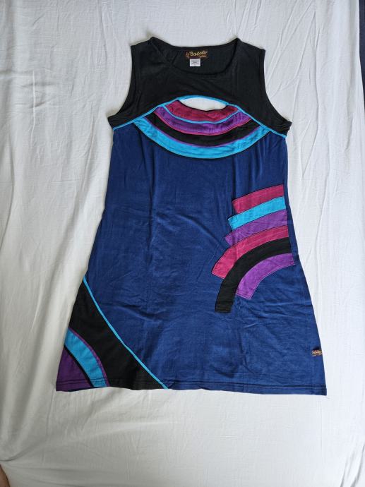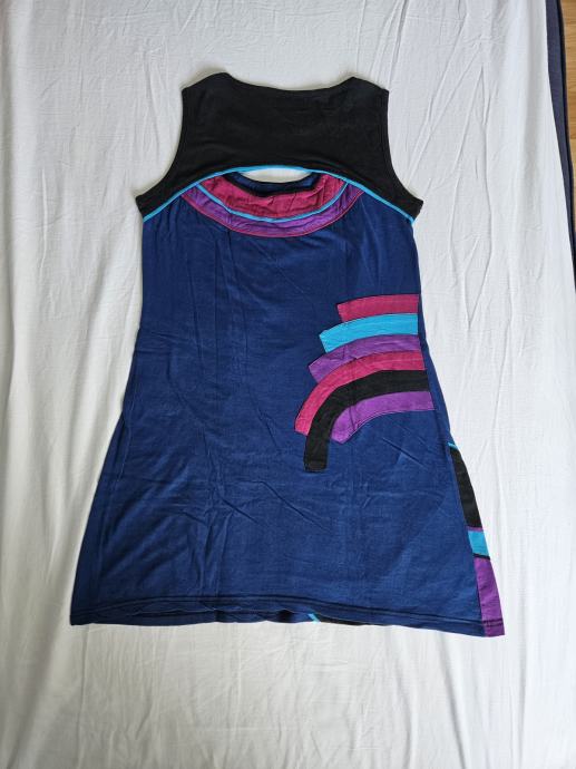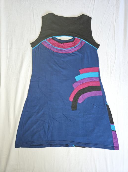 Zanimljiva retro ljetna haljina, pamučna, lagana. Uska uz tijelo, dužine iznad koljena, mini, A kroja. Ima mali izrez kao dekolte s prednje i stražnje strane. Tamnoplave boje, nije isprana. Veličina L, 40, elastična. Nošena svega par puta, odlično očuvana.