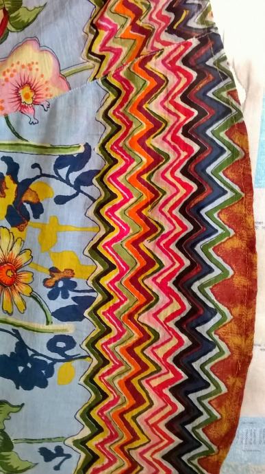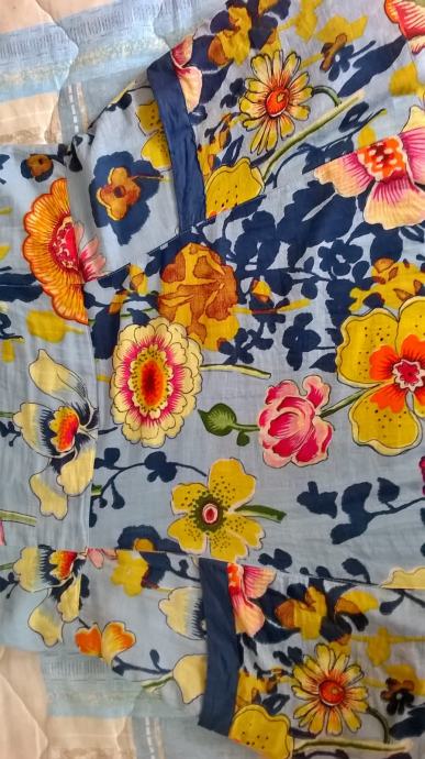 Sivo-plava podloga sa šarenim cvjetovima. Podstavljena pamučnom podstavom, tako da nije prozirna.