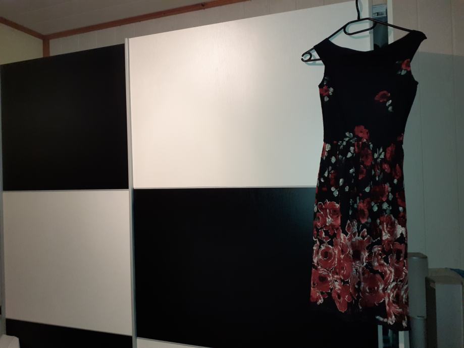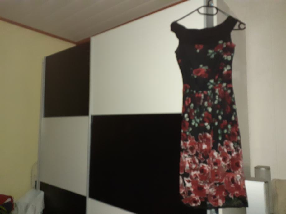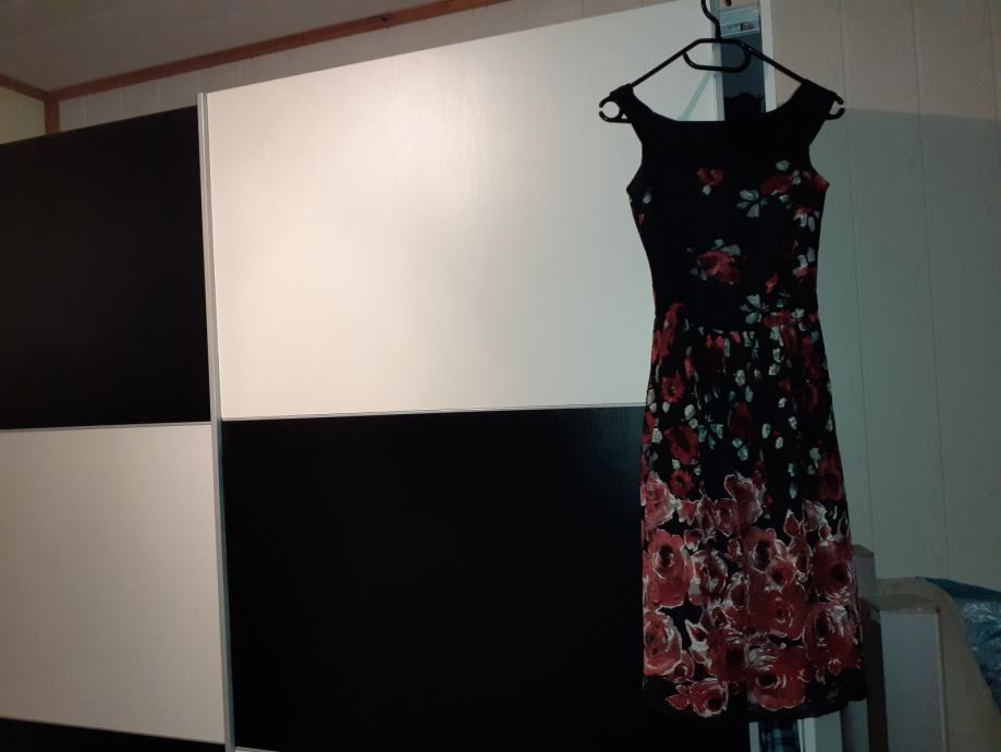 Haljina sa cvijetnim uzorkom na prvom sloju koji je poluproziran, sa unutarnje strane se nalazi jos crna svilena podloga, a oko struka je lagano elasticna.