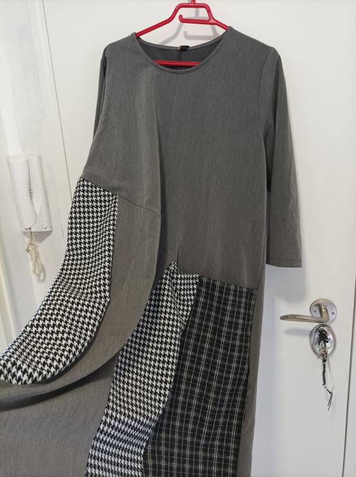 Siva haljina, nova s etiketom, plaćena 60 eura. Prekrasan materijal s dodatnim kvadratičastim materijalom. Na prednjem dijelu veliki džep.