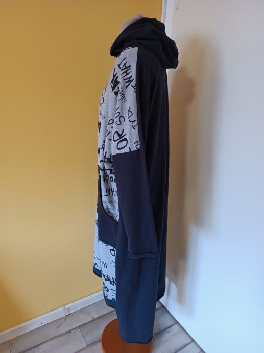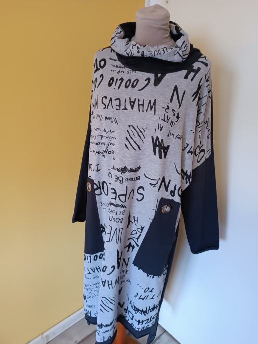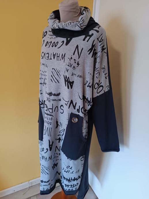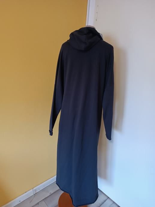 Nova haljina s etiketom. Ima kapuljaču, a i regulator kojeg možete namjestiti prema želji. Ispred nešto kraća. Na prednjem dijelu dva velika džepa. Komotna, ravni model.