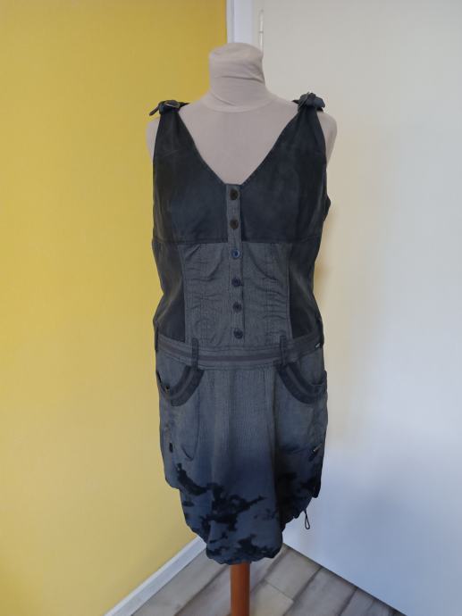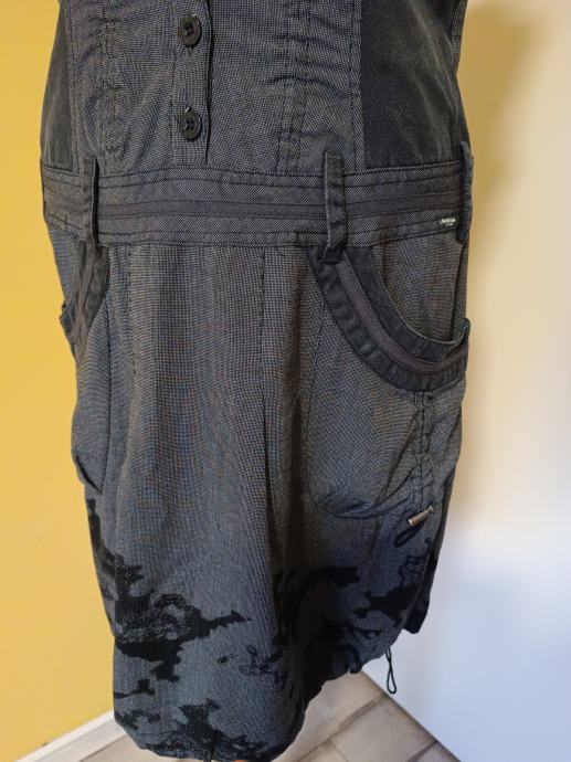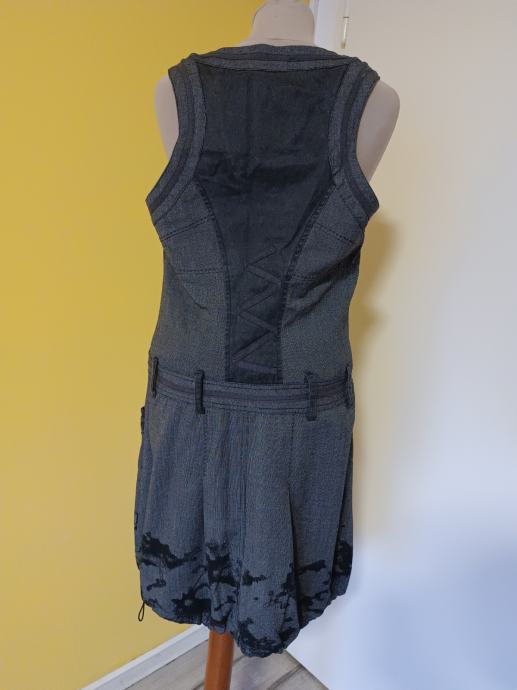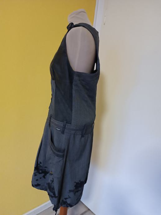 Siva haljina prepuna detalja poput gumba, džepova, vezica za zatezanje na dnu haljine. Vrlo lijepa i posebna. KOpča se gumbima na prednjem dijelu.