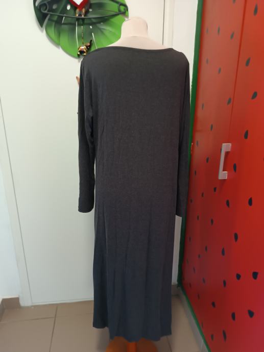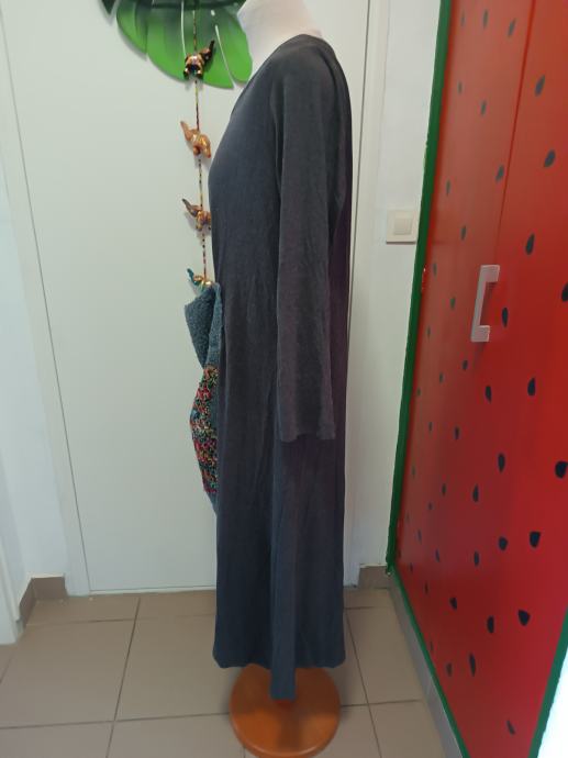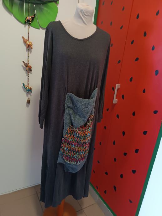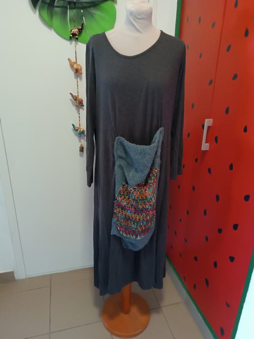 Prekrasna, impresivna mekana smeđa haljina s ukrašenim jedinstvenim, ručno rađenim džepom od šarenog tekstila.