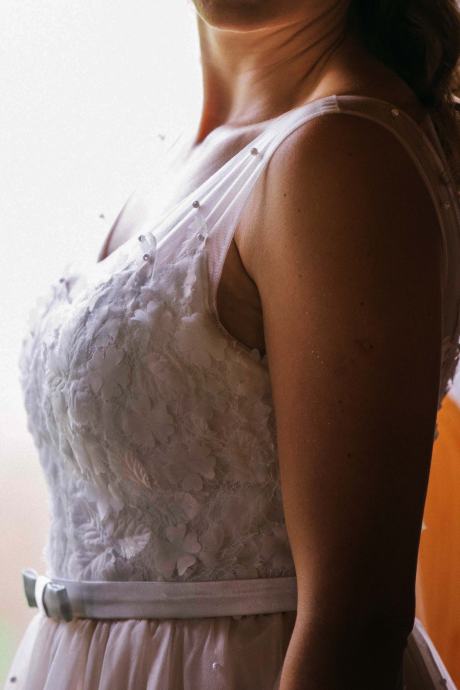 Donji dio od američkog satena boje šampanjca, a gornji dio od tila i sa 3D cvijetićima, podstava se može maknuti tako da cijeli gornji dio može biti proziran.