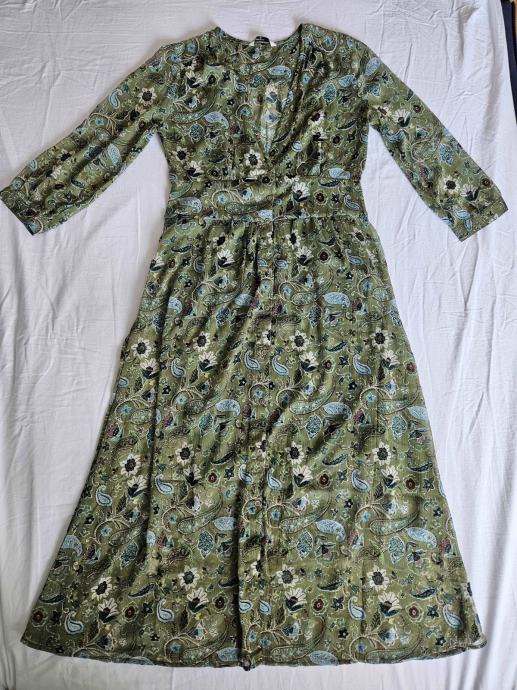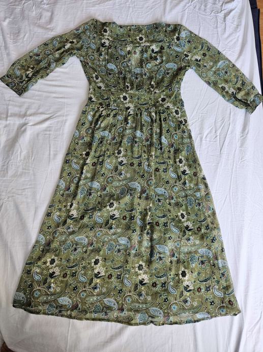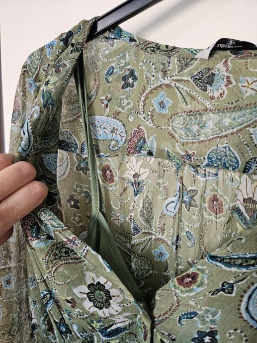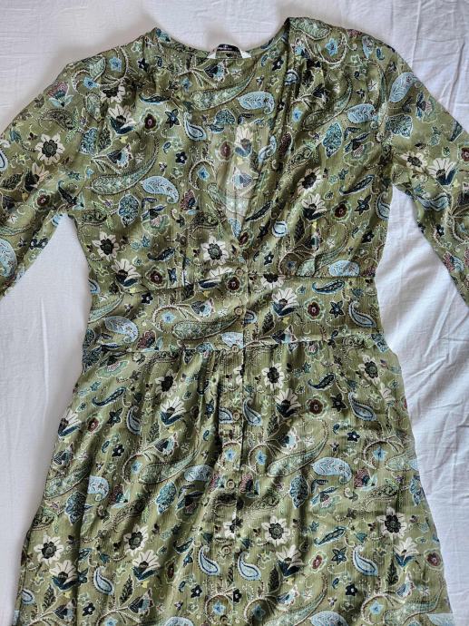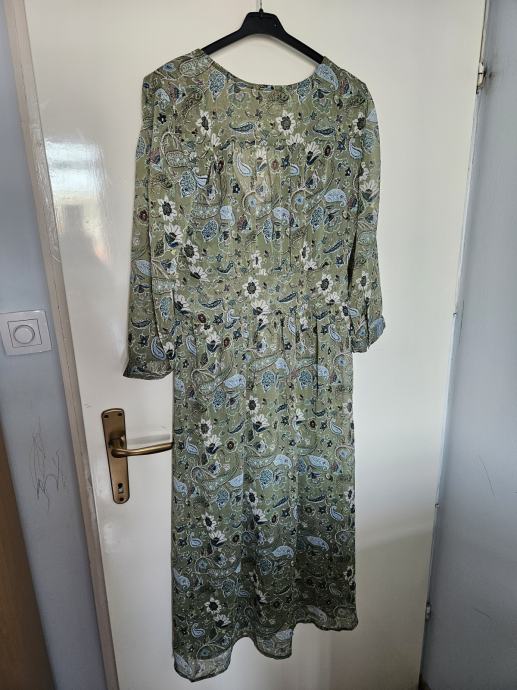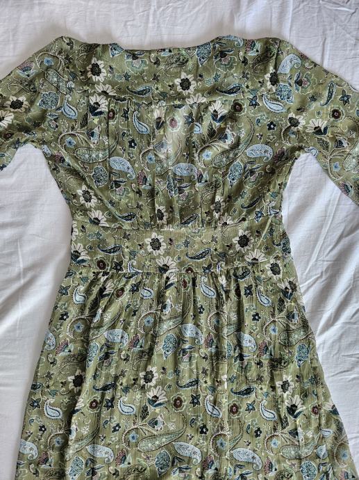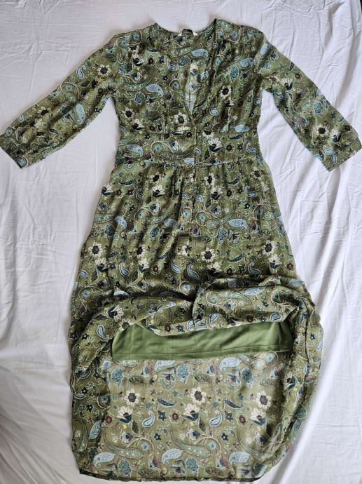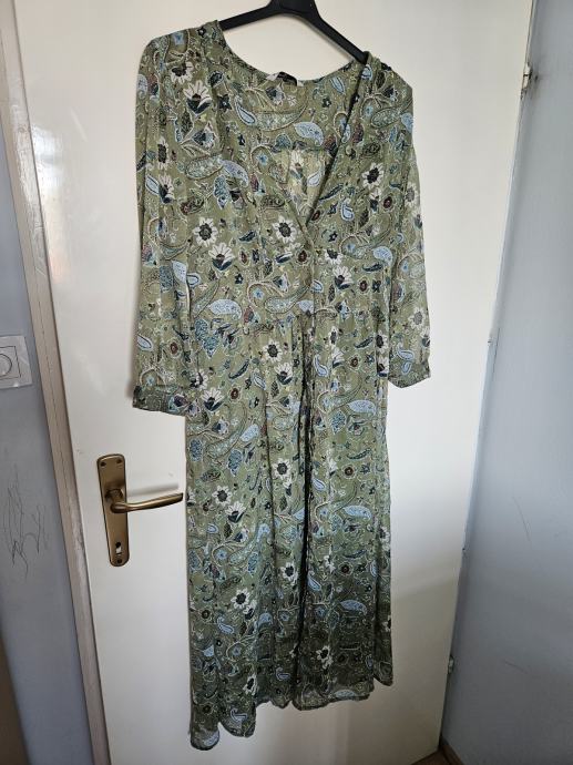 Nova ljetna haljina Stradivarius, samo oprana, nije nikada nošena. Lagana, prozračna. Strukirana, s prednje strane se otkopčava. Zelene boje sa zanimljivim uzorkom, lagano se prozire. Podstavljena sa dodatnom haljinom ispod na bretele zelene boje. Dužine ispod koljena. Veličina L, 38 / 40.