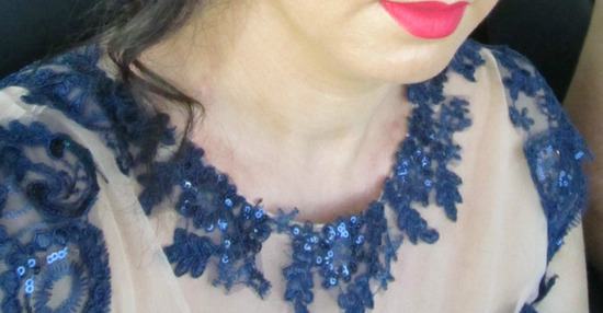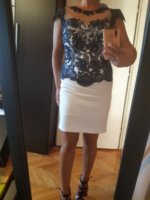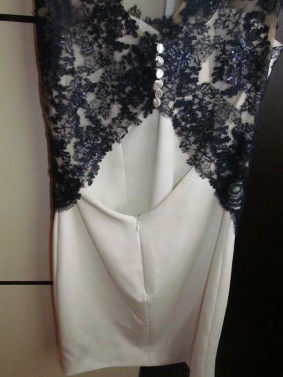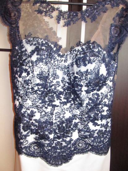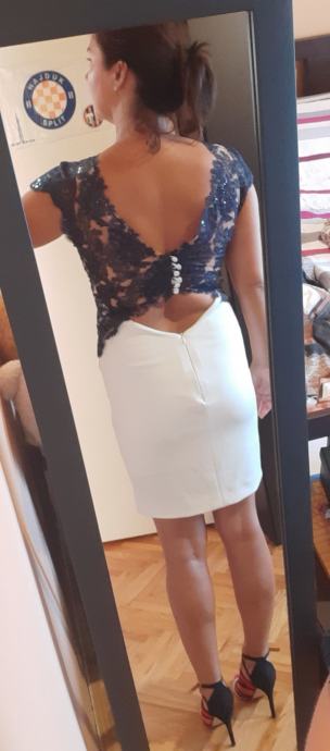 haljina lijepog kroja šivana po mjeri, od kvalitetne tamno plave čipke s perlama i deblje likre ivory boje, nošena dva puta, oprana i spremna za novu vlasnicu, odgovara veličini 38/40, mjere na upit