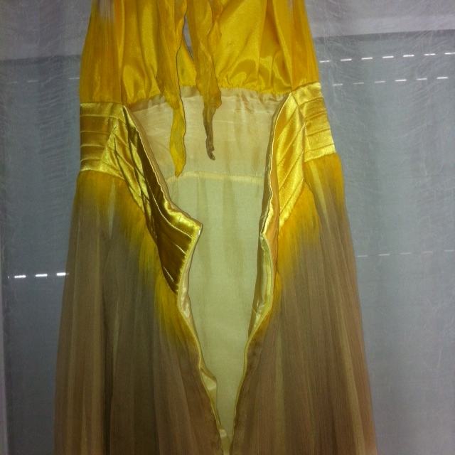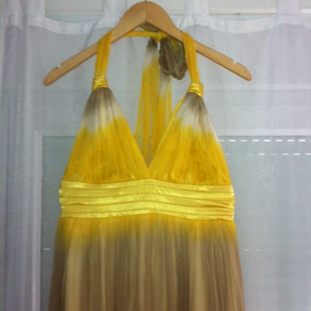 Duga svečana haljina žuto-smeđe boje. Šivana po mjeri, nošena samo jednom. Otvorena leđa, rezana ispod prsiju, veže se trakicama oko vrata, ciferšlus na leđima, podstava. Ima satenske dugačke vezice kojim se može omotati oko struka.