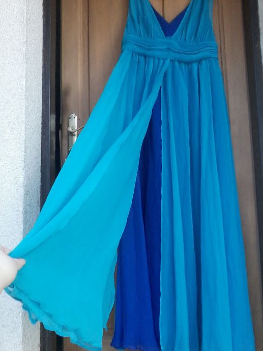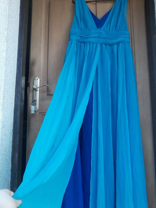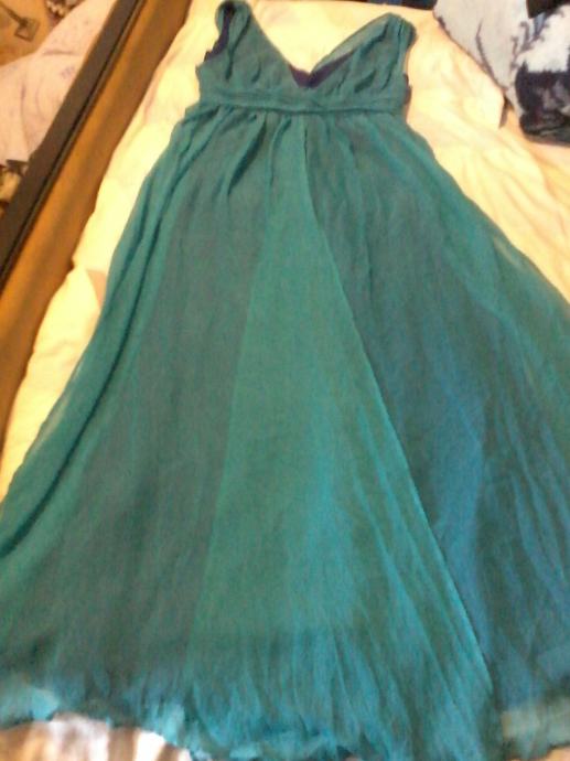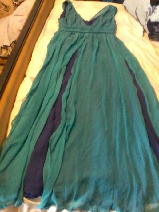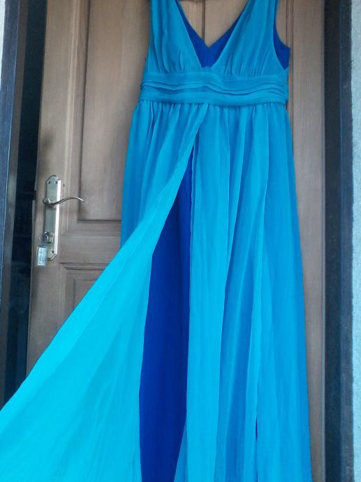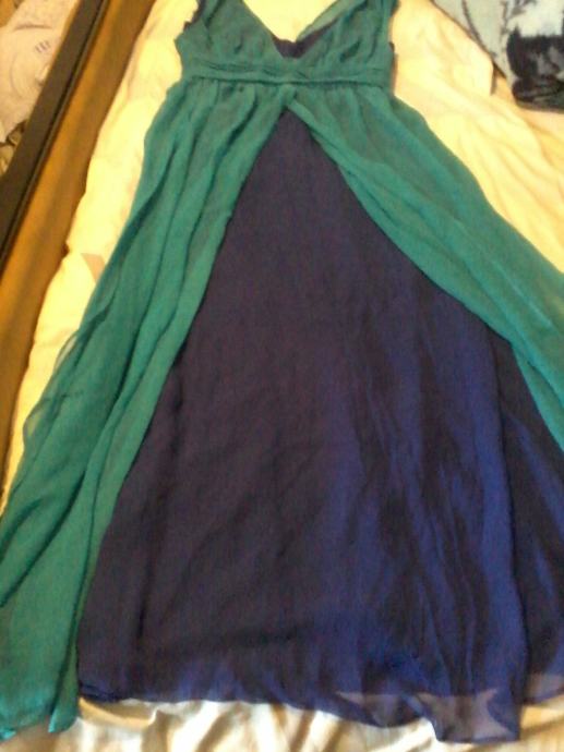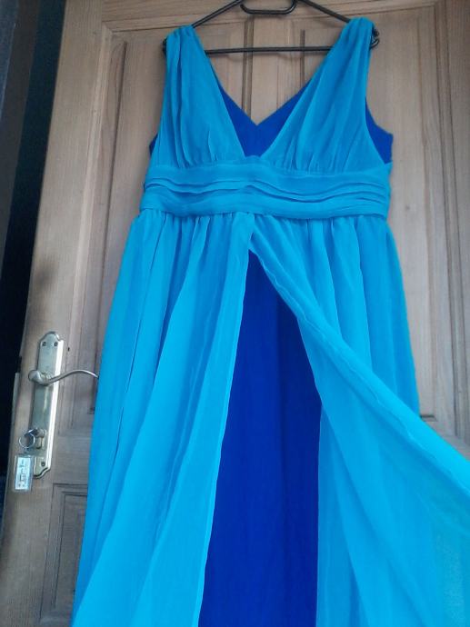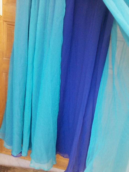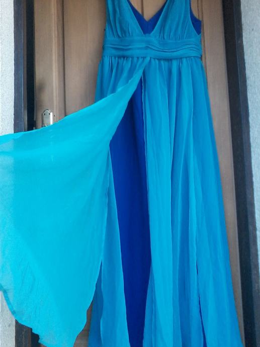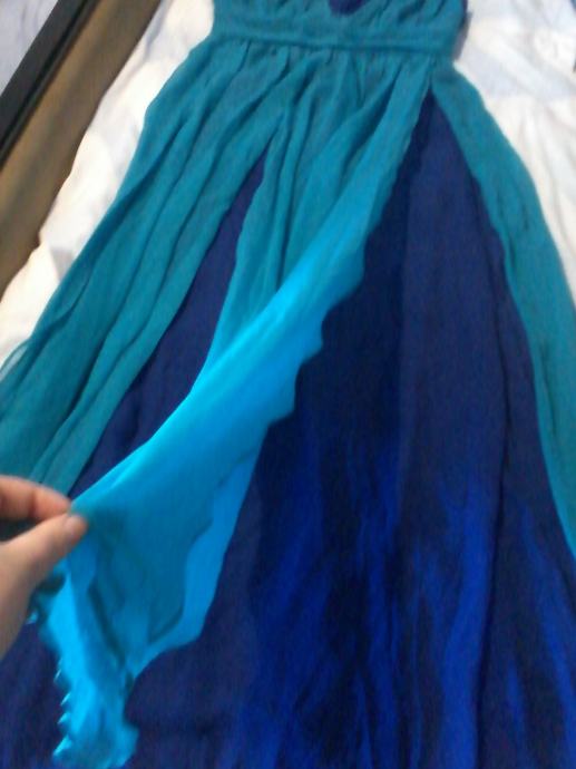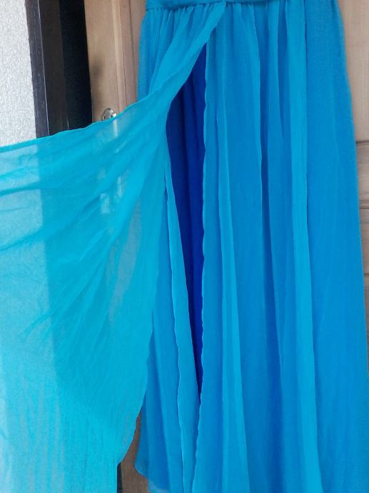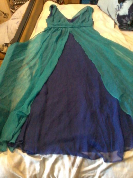 NOVA SVEČANA DUGA HALJINA, predivna. Ispod ima ljubičastoplavu tkaninu, iznad ima tirkiznu prozirnu lepršavu tkaninu koja ima proreze tako da se može vidjeti tkanina ispod. Veličina je XL. Haljina je potpuno nova. Iza ima zatvarač. Ispod prsa haljina se širi kao zvono, pada sve do poda. Za svečane je prilike.