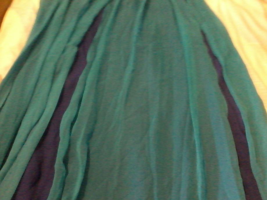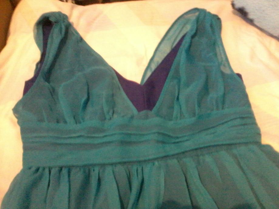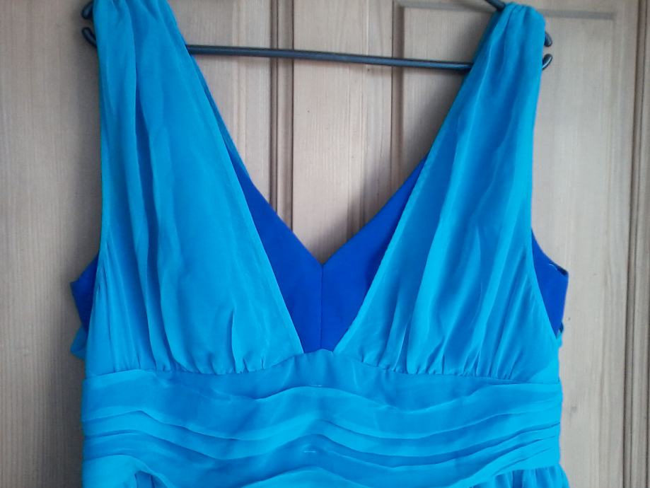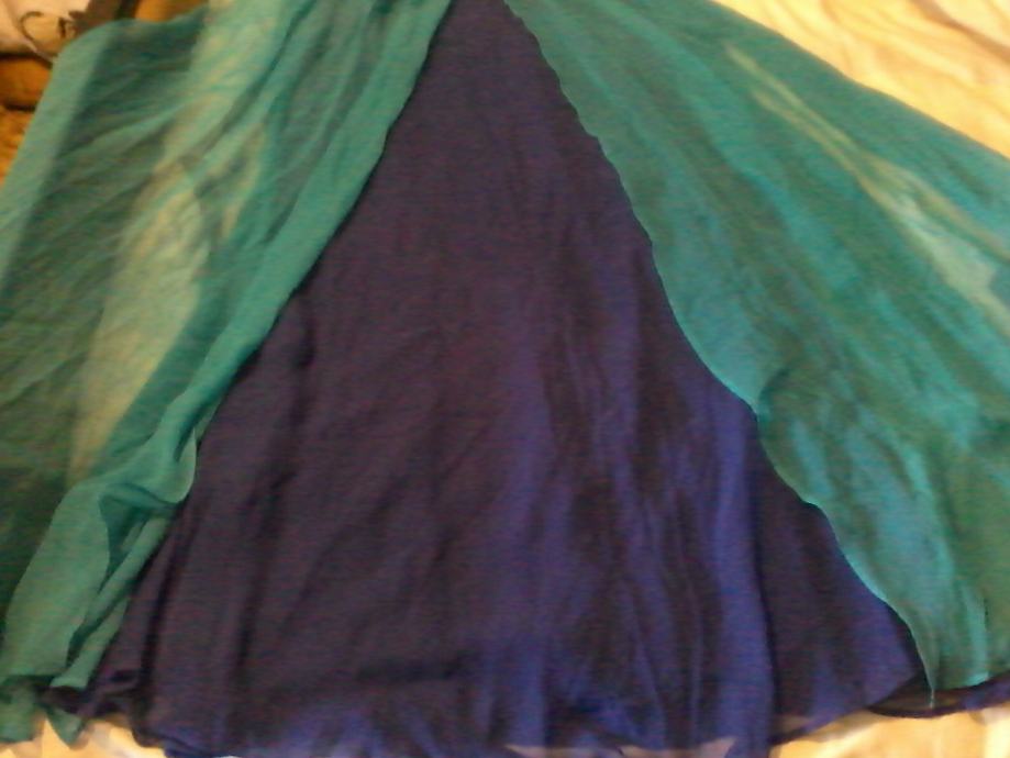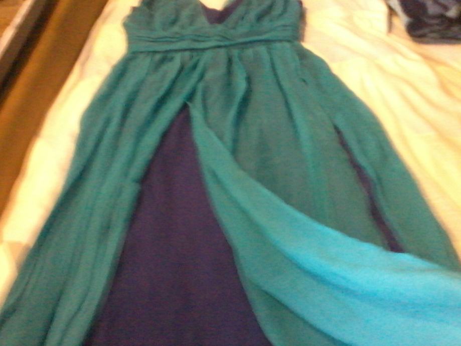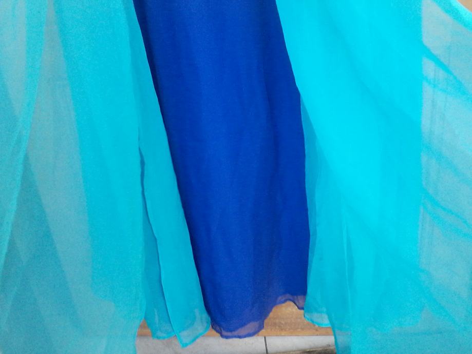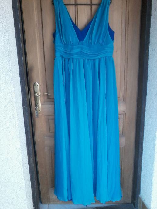 NOVA SVEČANA DUGA HALJINA, predivna. Ispod ima ljubičastoplavu tkaninu, iznad ima tirkiznu prozirnu lepršavu tkaninu koja ima proreze tako da se može vidjeti tkanina ispod. Veličina je XL. Haljina je potpuno nova. Iza ima zatvarač. Ispod prsa haljina se širi kao zvono, pada sve do poda. Za svečane je prilike.
