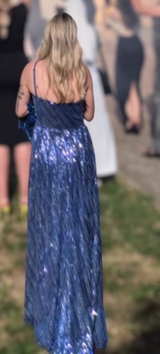 Duga svečana plava šljokičasta haljina, jednom nošena, haljina ima naramenicu s lijeve strane, patent od iza na leđima.
