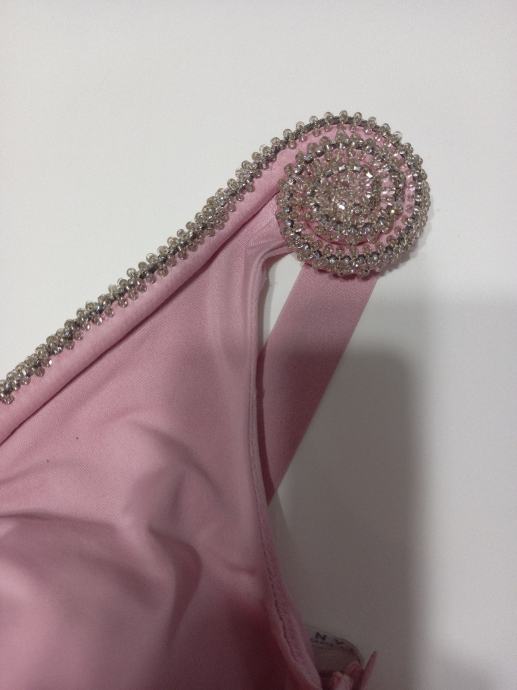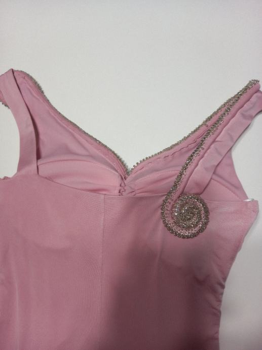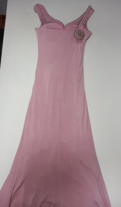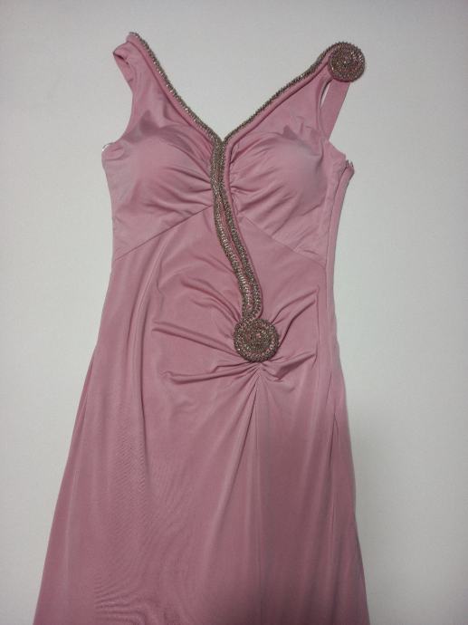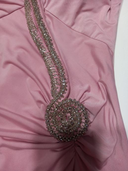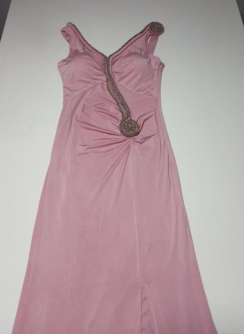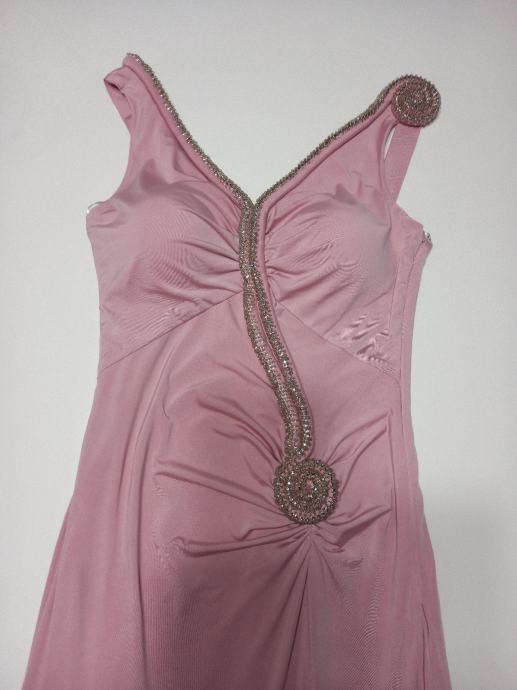 Svečana, dugačka, roza haljina sa šljokicama, vel. 38...sa jastučicima za grudi, patent zatvarač sa strane, prorezom naprijed, podstava, proizvođač: INVITO........