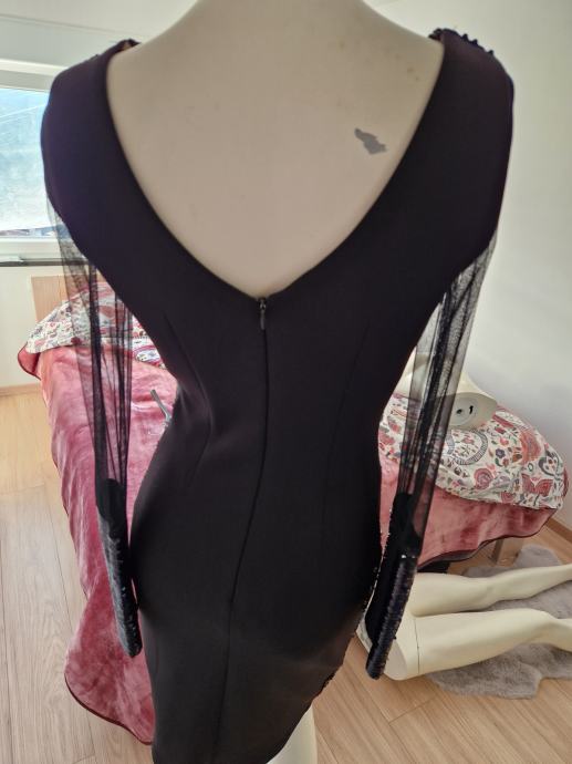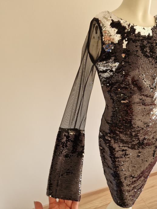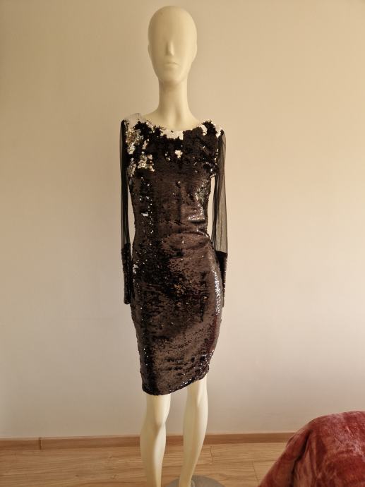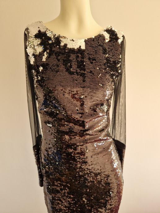 Svečana nova haljina bez etikete s ljuskicama naprijed i na rukavu koji je proziran.