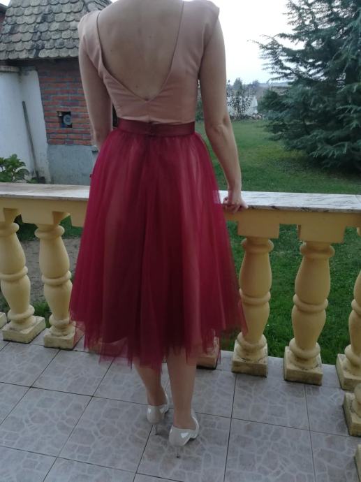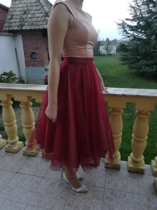 Predivna haljina iz dva dijela bordo-krem kombinacije. Gornji dio je krem ili šampanj boje koji je dovoljno dugačak kako se ne bi izvlačio iz suknje. Također je postava donjeg dijela haljine izrađena od istog materijala kako bi bila čvrsta, a preko ide bordo til. Haljina je jako ugodna i elegantna za svečane prigode. Odgovara veličini 38. Osoba na slikama: 173 cm + štikle, 63 kg.