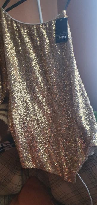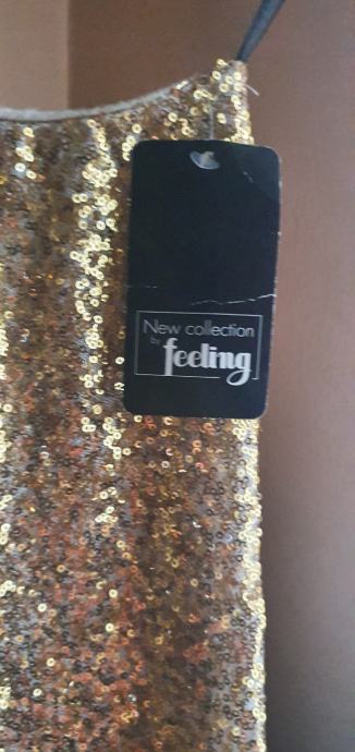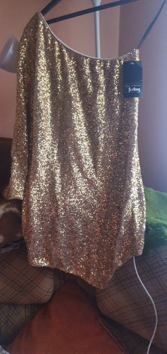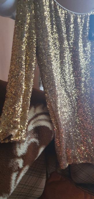 Ljepa ,šljokasta haljina boje zlata nepravilnog lepog kroja sa jednim rukavom,za sve svecanije prilike