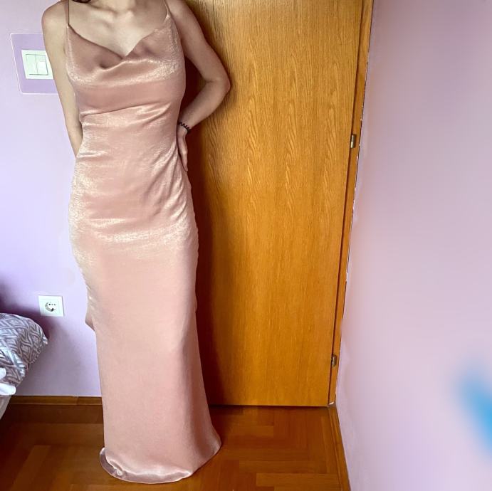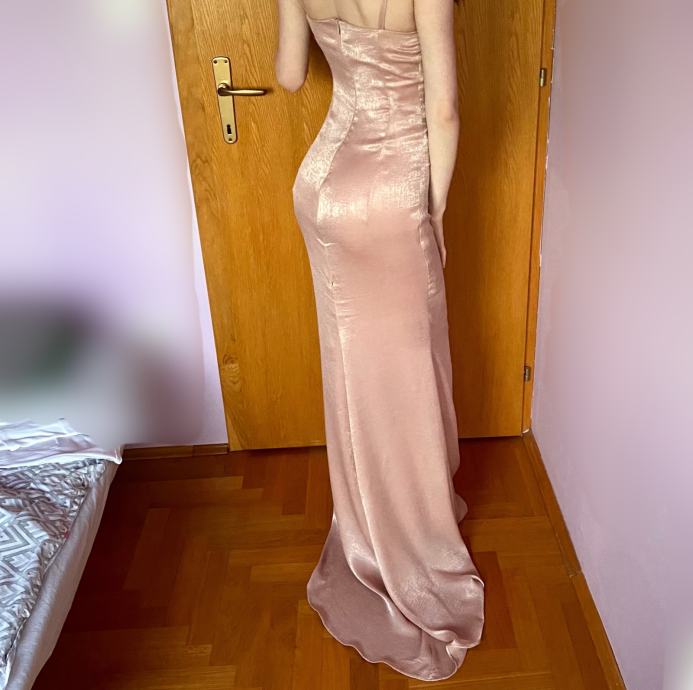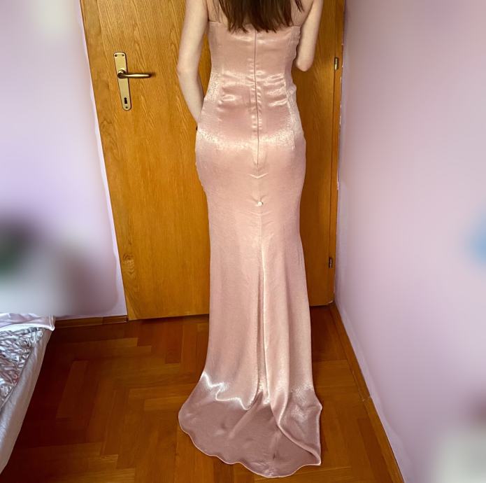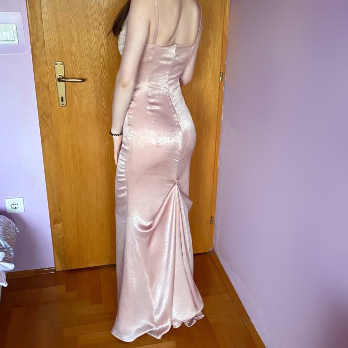 Prodajem svečanu satensku haljinu boja puder-roza. Šivana po mjeri, odgovara veličini XS/S. Nošena jedanput povodom maturalne zabave. Kemijski očišćena, bez oštećenja.