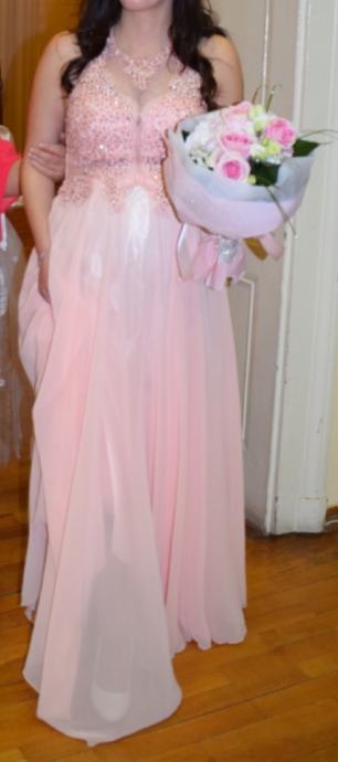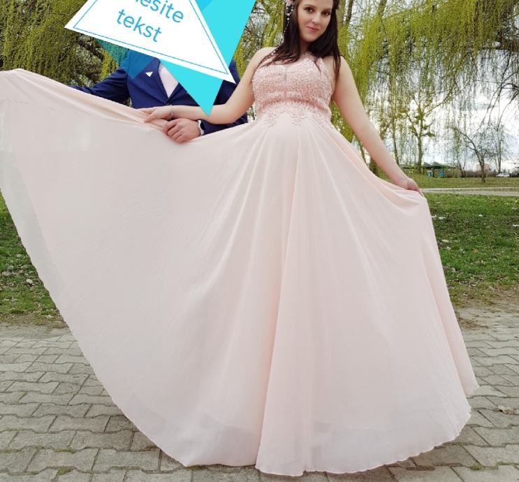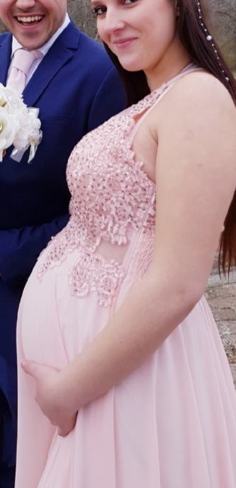 prodajem svečanu haljinu,1x nošena u svatove,M veličina,rastezljiva,visoka sam 167 te slikano u 9mj trudnoće,očuvana,bez greške