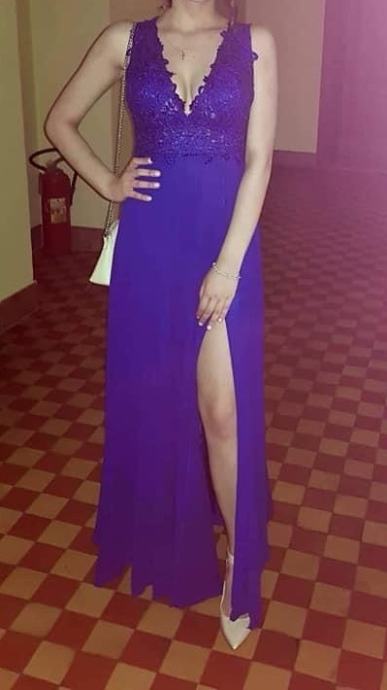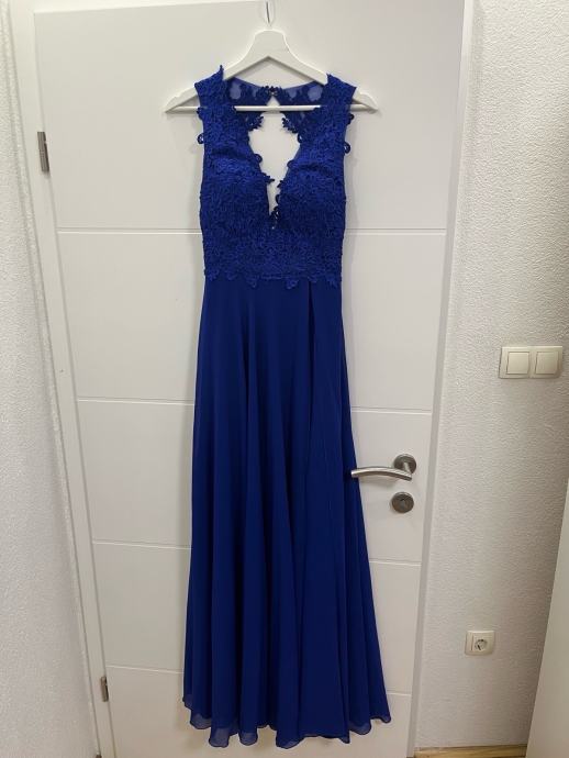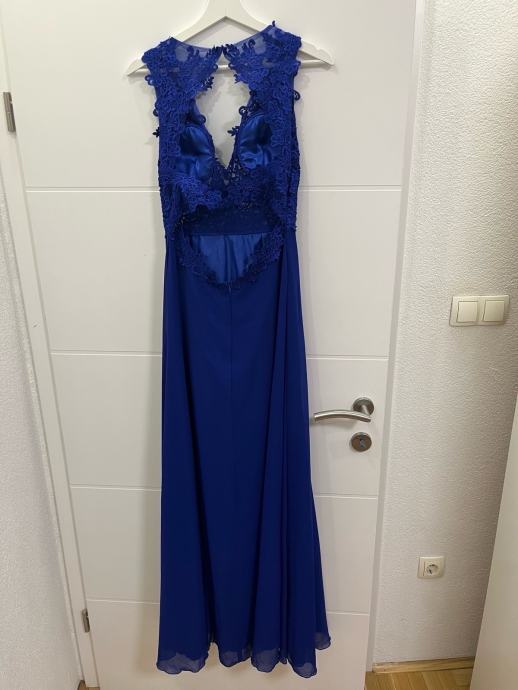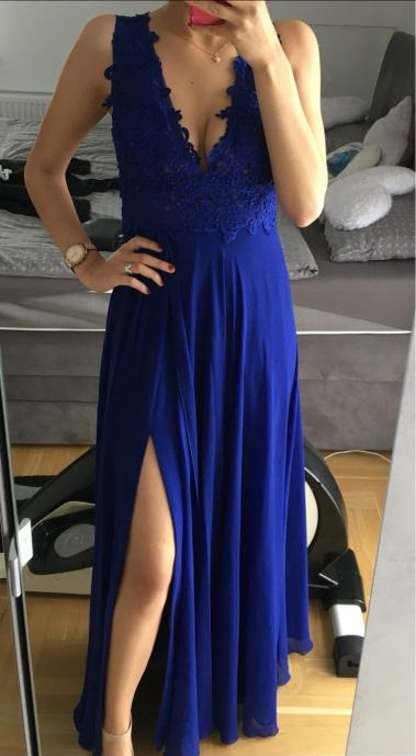 Svečana kraljevsko plava haljina sa prorezom sastrane i čipkom na gornjem dijelu haljine te s otvorenim leđima.