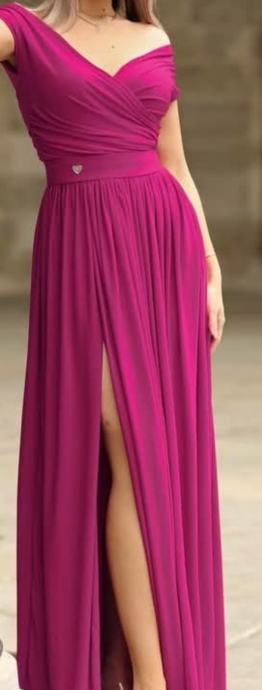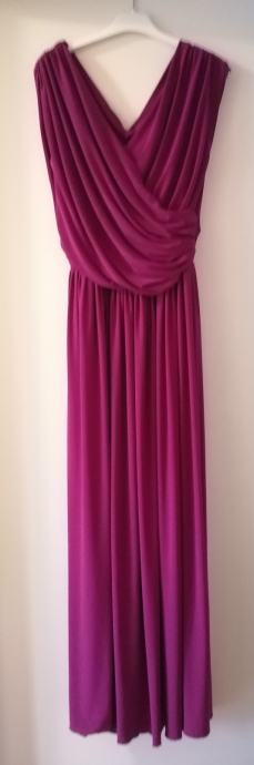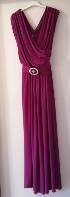 Prodajem midi svečanu dizajnersku haljinu sa remenom, ciklama boje, nošenju 1 puta, jako udobnu, prilagodljivu vel. 38-40. Na poklon je šal iz istog materijala