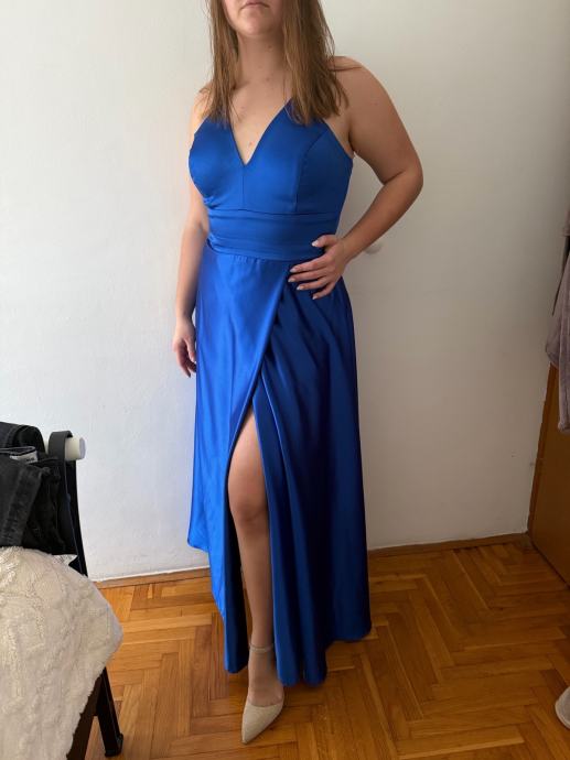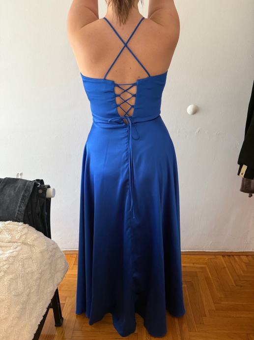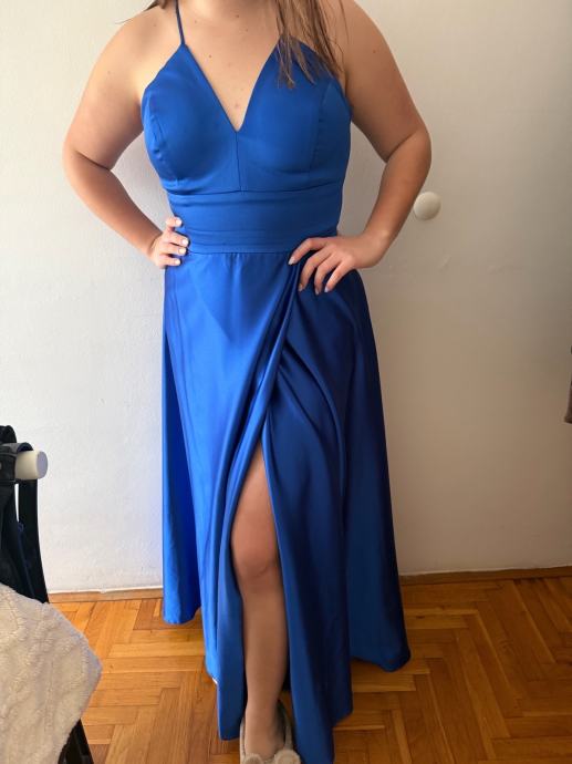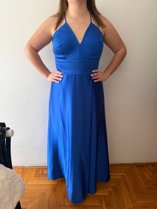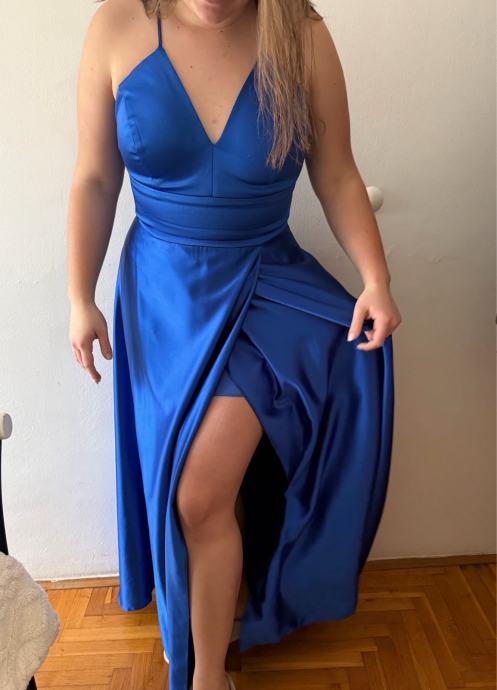 Prodajem prekrasnu svečanu haljinu u kraljevsko plavoj boji, izrađenu od satena. Haljina je veličine 40 i dužine ispod koljena. Ima elegantan kroj s dubim V-izrezom i tankim bretelama koje se vežu na leđima. Struk je naglašen širokim pojasom, a suknja ima efektan prorez sa strane. Materijal je kvalitetan saten koji lijepo pada i daje raskošan izgled. Haljina je nošena samo jednom odličnom je stanju.