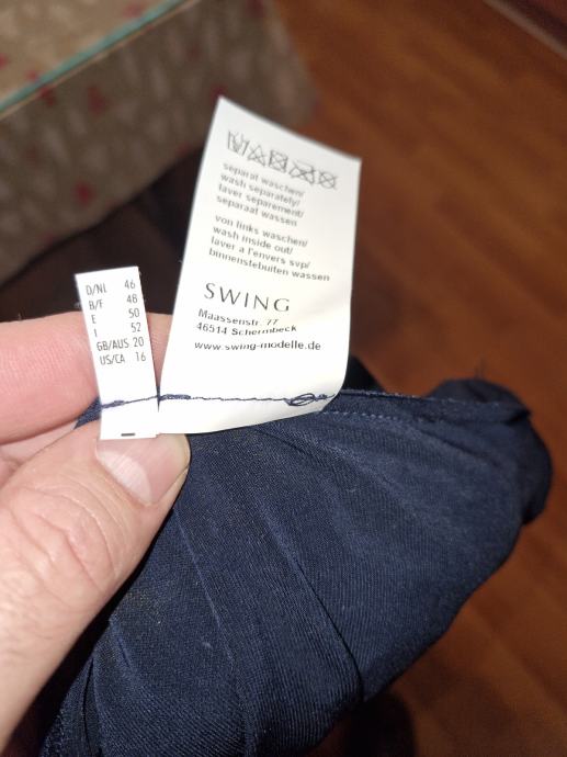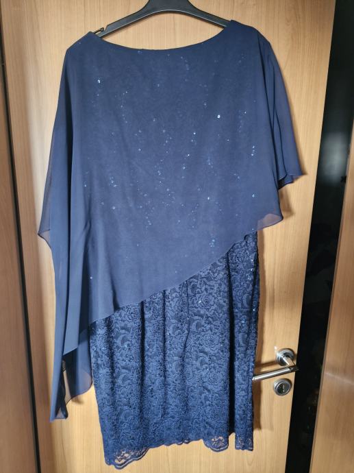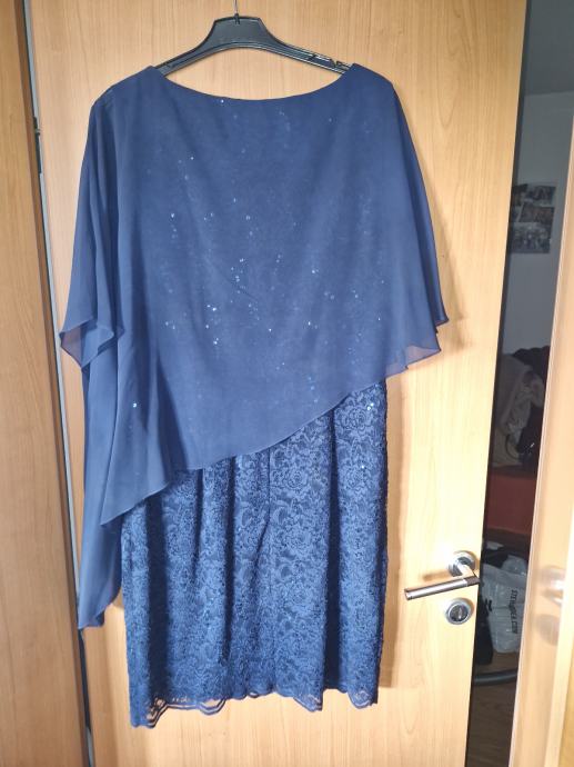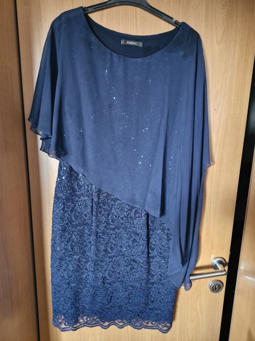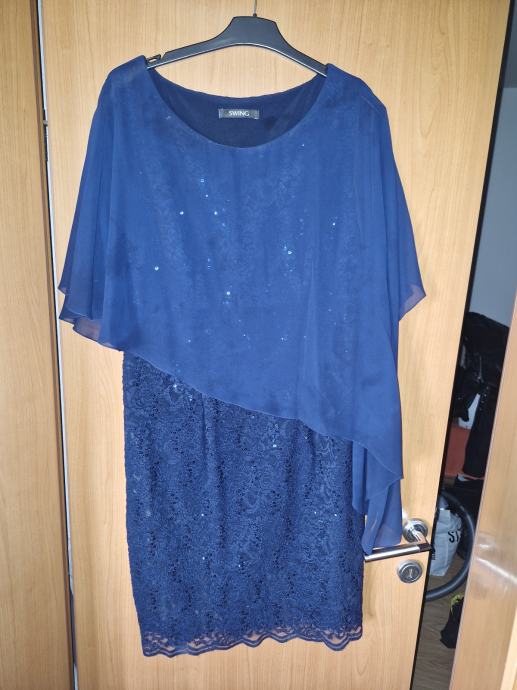 Elegantna plava svečana haljina Swing veličine 50, izrađena od viskoze i poliestera, jednom nošena . Posebnog dizajna s čipkastim donjim dijelom do koljena i prozračnim gornjim slojem sa suptilnim šljokicama. Savršen izbor za posebne prilike ili svečane događaje.