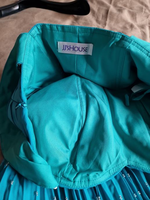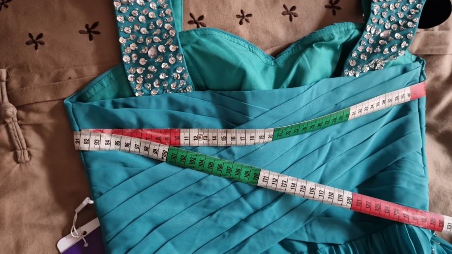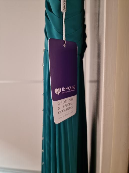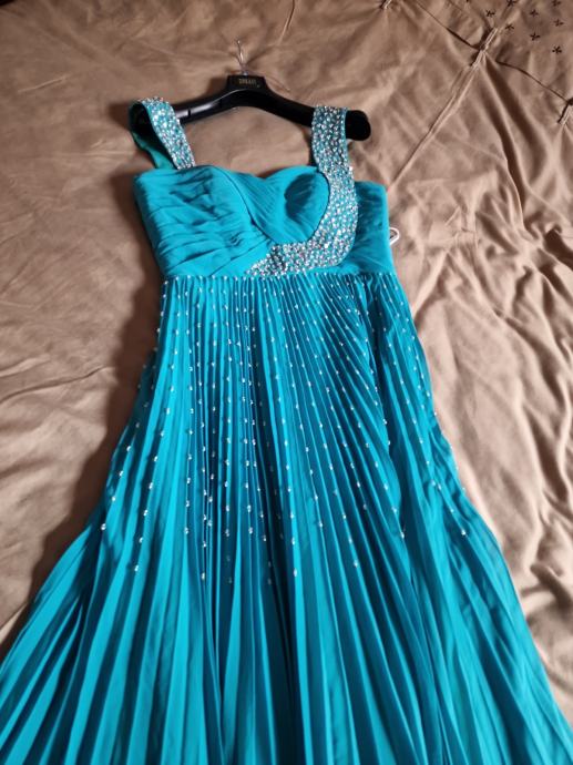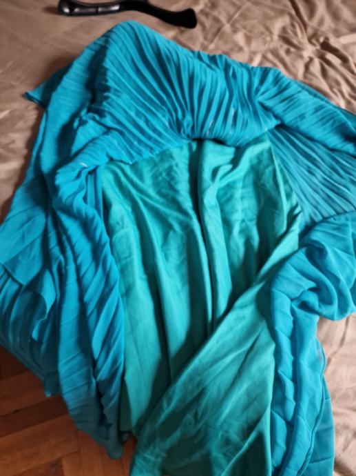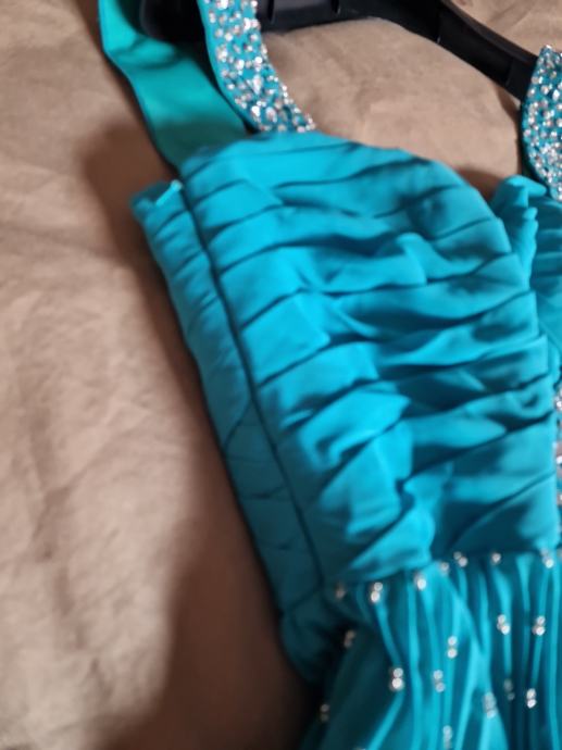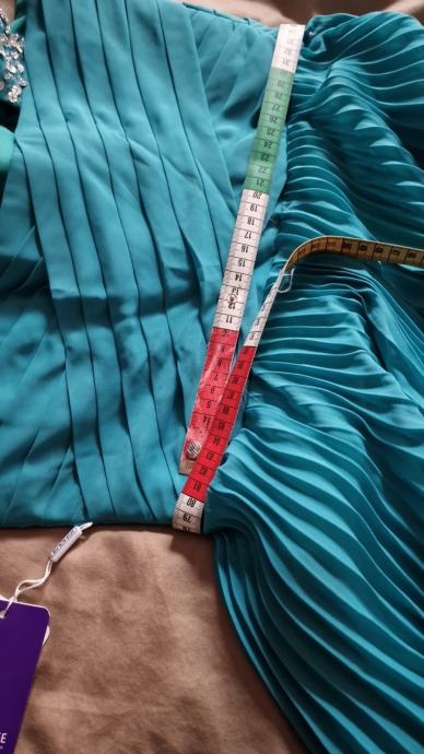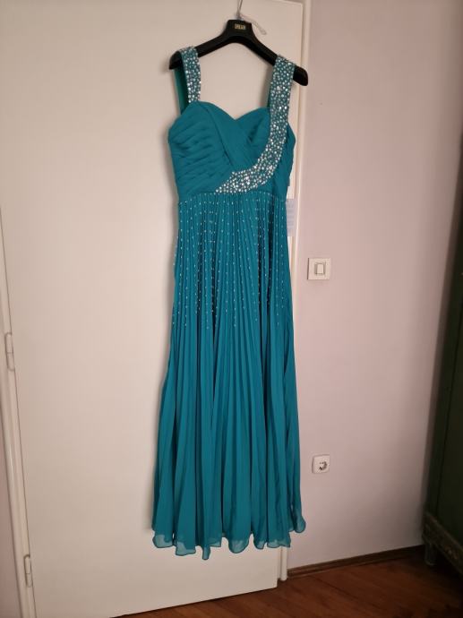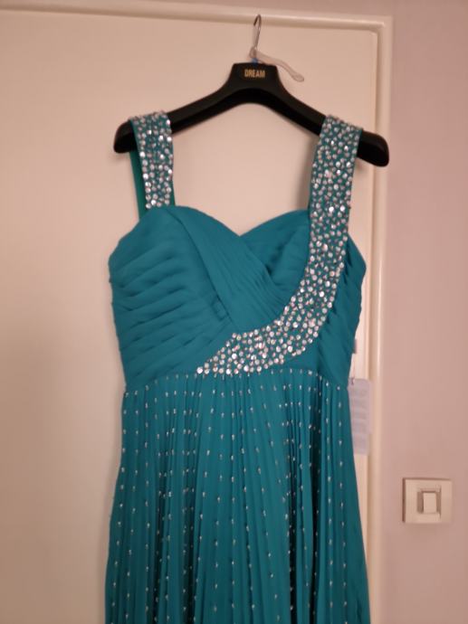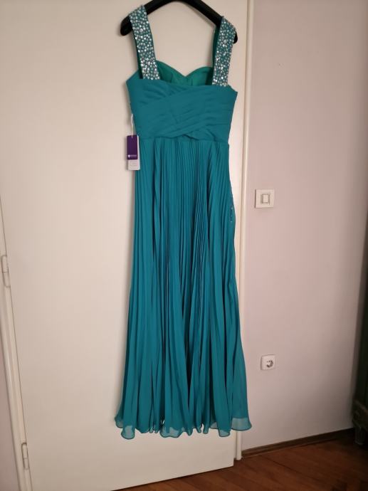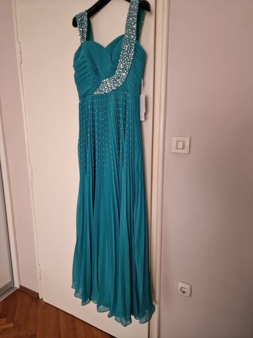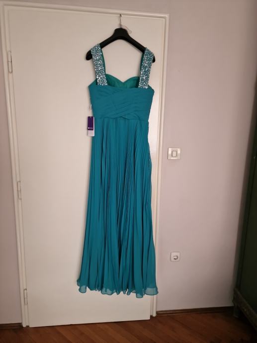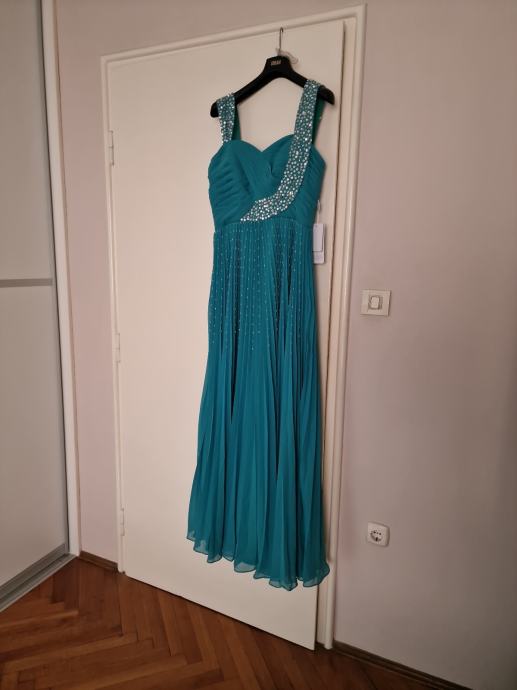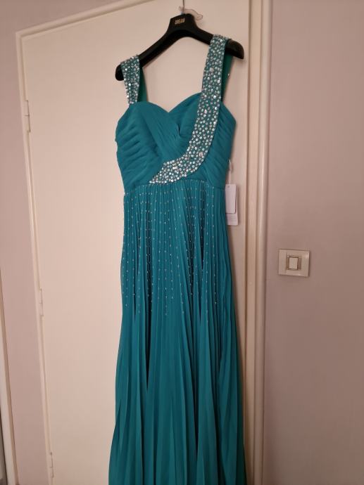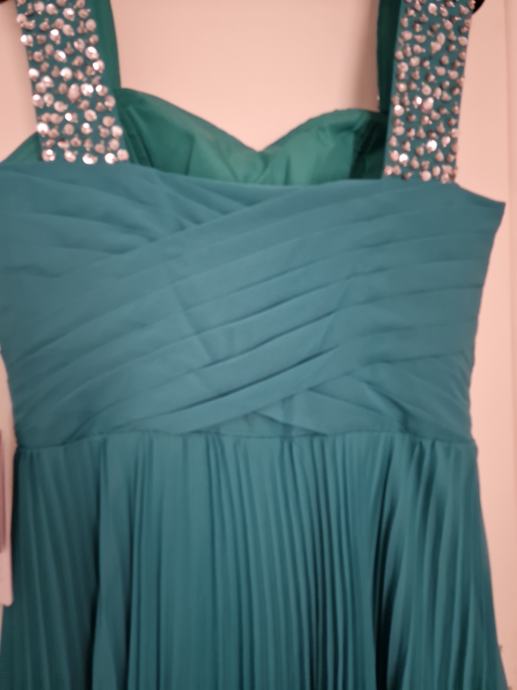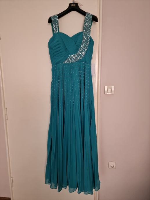 Prodajem prekrasnu, novu haljinu za vjenčanja ili specijalne prigode, boje žada, veličina L/40 (12), plisirana u gornjem dijelu drapirana sa kosaricama i udrugama za grudi, podstavljena, ukrašena perlicama i fliterima.