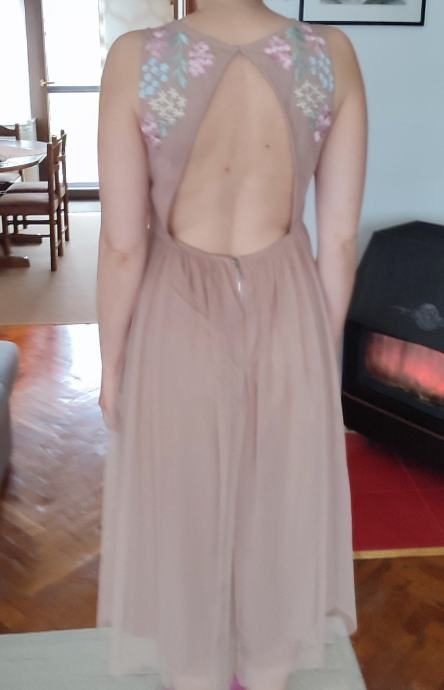 Prodajem jednom nošenu haljinu u odličnom stanju, bez tragova nošenja. Jako lagana i ugodna na tijelu. Marka Maya deluxe, veličina 38. Materijal til, boja nude, šarena čipka na prsima