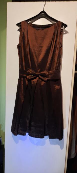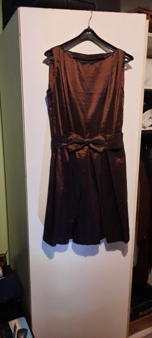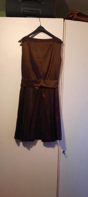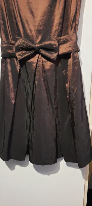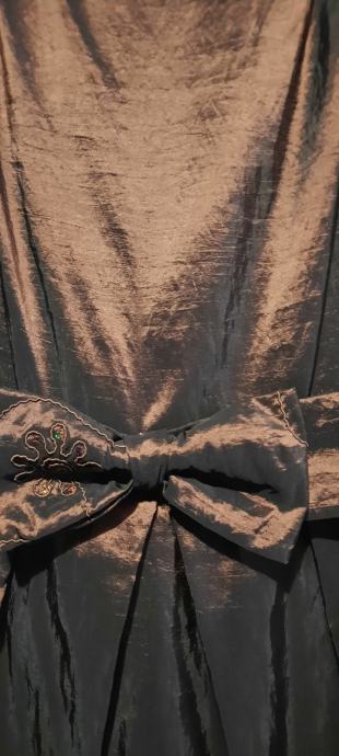 Nošena na jednoj svadbi. Svila sa metalik odsjajem. Puno ljepša u stvarnosti. Dužina do koljena 98 cm. Širina u prsima 48 cm, struk 38 cm. Ukrašena u struku ukrasnom mašnom.