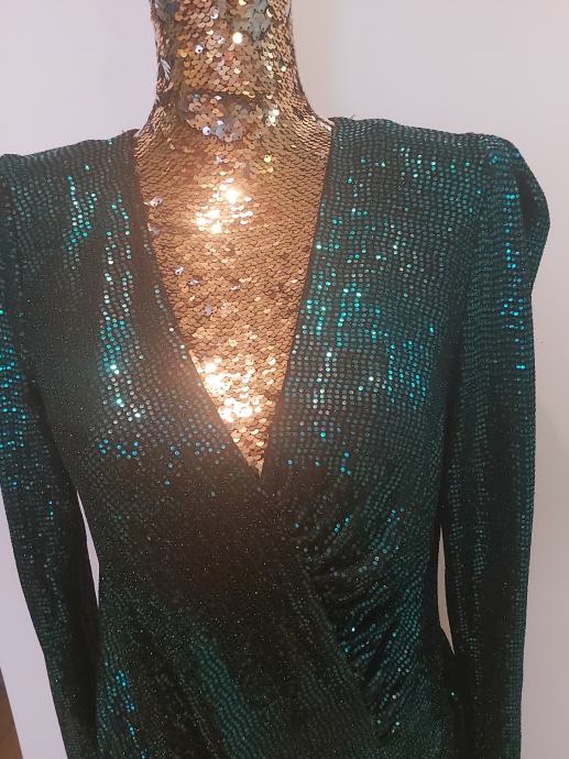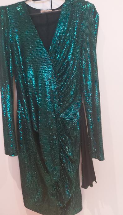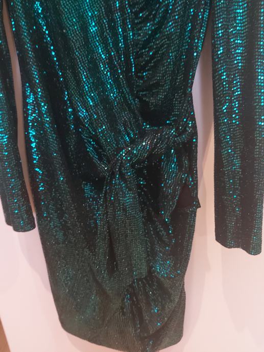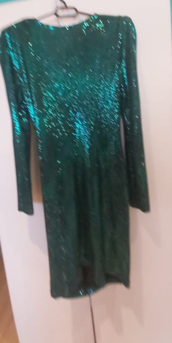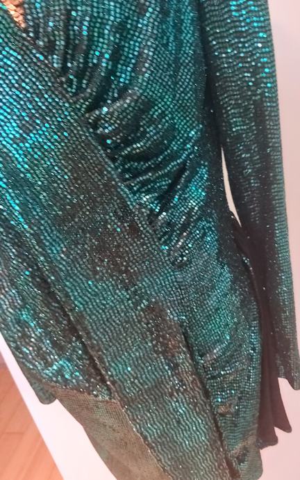 U vrlo dobrom stanju šljokasta haljina zanimljiva kroja ,rmalo rastezljiva ,može od broja 42do 44 za osobu oko 1.65 i više