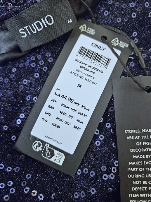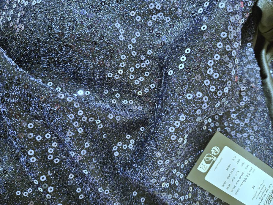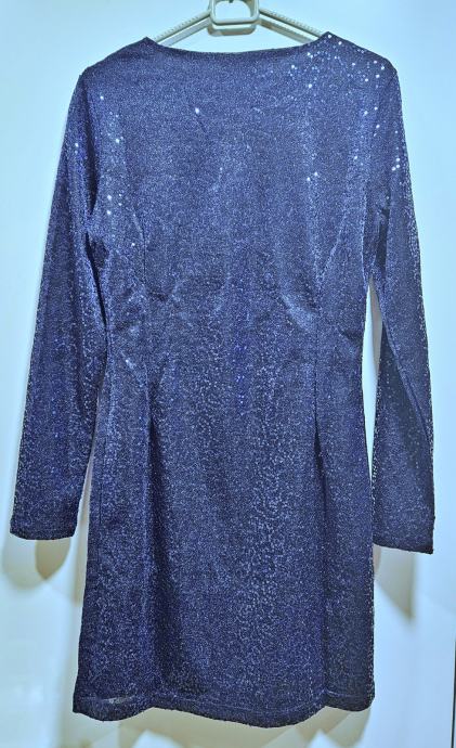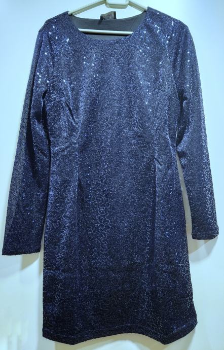 Nova,nenošena tamnoplava šljokičasta haljina dugih rukava,predivno stoji. Na slikama izgleda sivkasto,ali je baš tamnoplava. Vel M. Ramena 40, prsa 44,struk 38,dužina 85. Meni je prekratka,samo zato prodajem. Plaćena 45e.