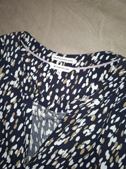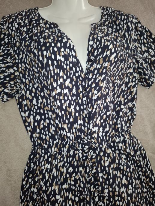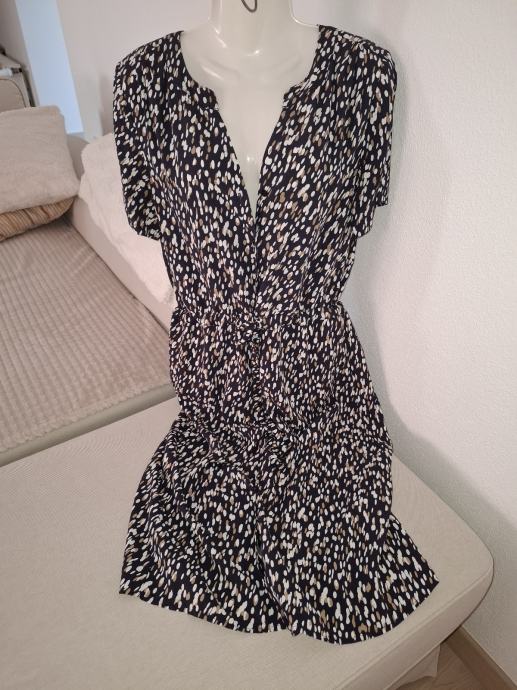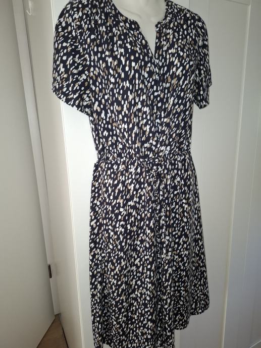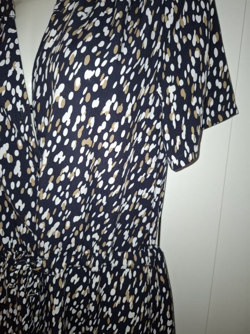 Haljina je samo jednom nošena, 100% viskoza, jako ugodna, deklarirana kao 36 ali je široki model i definitivno odgovara za vel M. Dužina 108 cm, kopča se cijelom dužinom, ušivena vezica u struku.