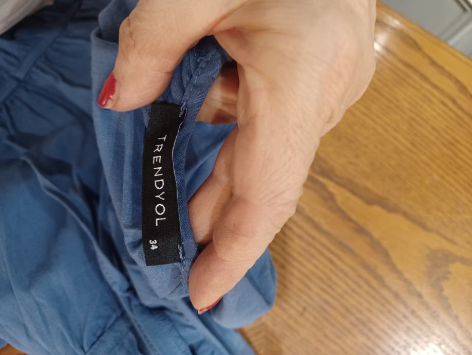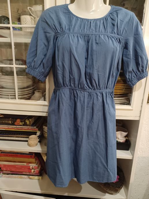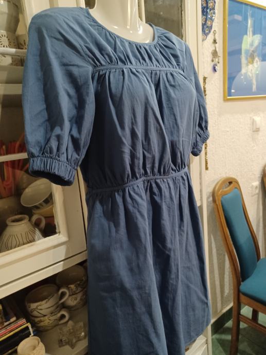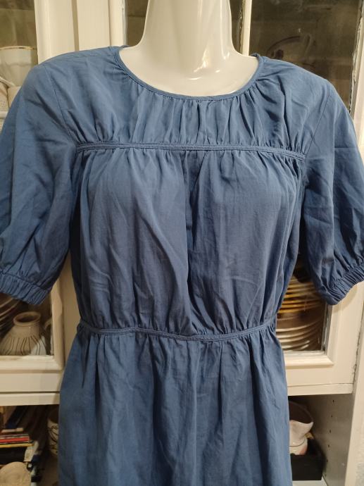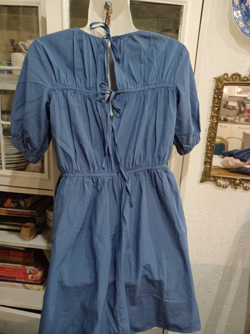 TRENDYOL plava pamucna nabrana haljina 3 cetvrt rukava, na vezanje masnama na ledima, vel. 34. Širina prsa, prednja strana: 46 cm, struka: 38 cm, duzina: 80 cm.