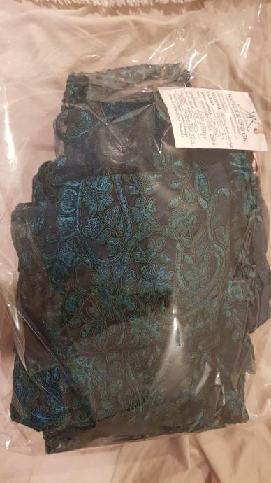 Prodajemo jedinstvenu ručno šivanu haljinu od dizajnerice Katarine Mamić, posebno šivana i napravljena od čipke po mjeri klijentice. Haljina je u top stanju, nošena je i isprobana svega samo dva puta DOMA i niti jednom nije bila nošena vani. Kroj haljine je u stilu sireninog repa, sa bojom paunovog perja jer fotografije ne prikazuju boju kvalitetno. Idealna je za večernje tulume, vjenčanja ili druge svečanosti, za sitne i vitke žene DO 169/170cm (S/XS ILI 34/36 veličina). Ako imate zelene oči ova haljina će Vam savršeno pristajati! Kupljena 2018., originalna cijena 1800kn.