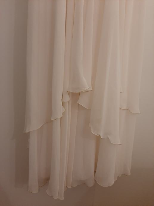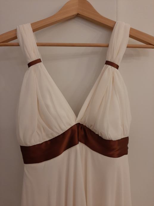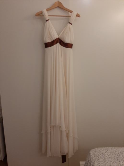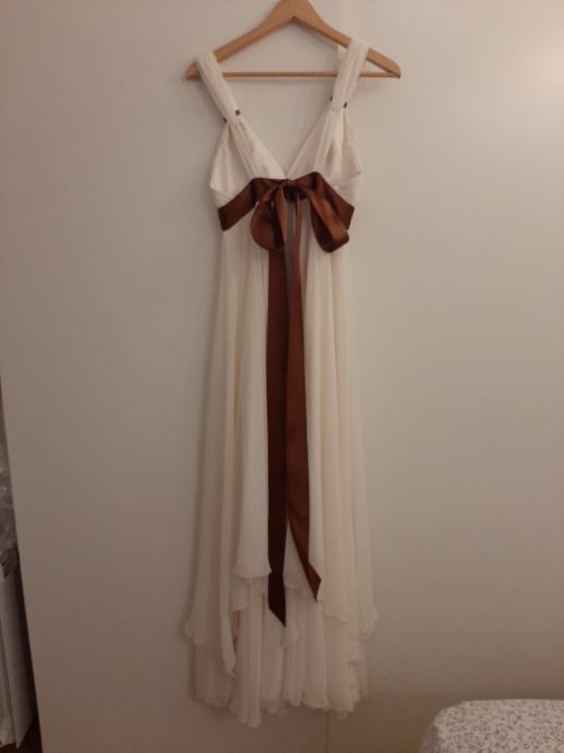 Duga vjenčanica, bijele boje sa smeđim ukrasima i mašnom na leđima. Za osobu od cca. 170 cm, veličina S/M.