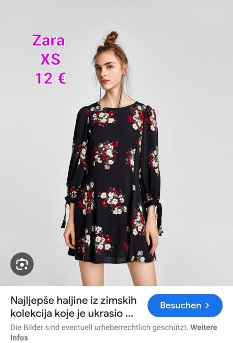 Šarena ZARA haljinica veličine 34, s dugim rukavima i dužinom iznad koljena. Nošena ali još uvijek vrlo atraktivna s lijepim cvjetnim uzorkom na tamnoj pozadini. Savršena za prijelazno razdoblje ili kombiniranje s čarapama tijekom hladnijih dana.
