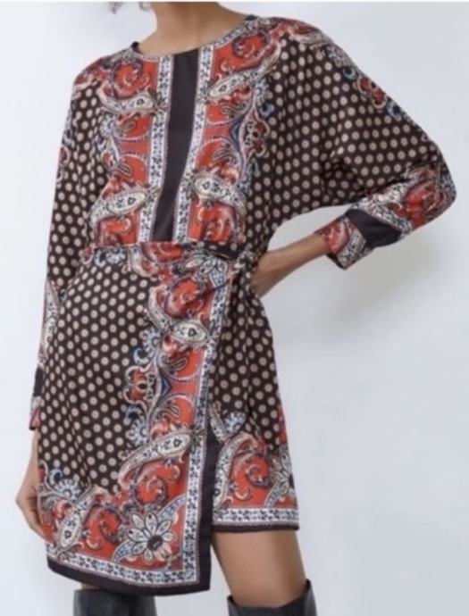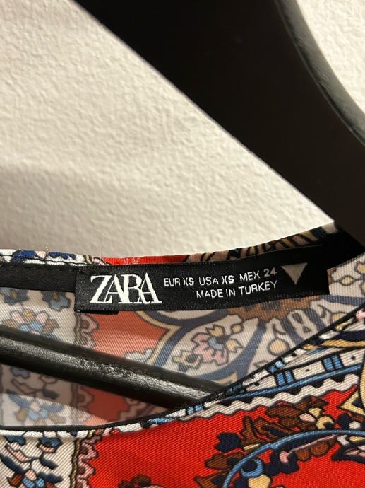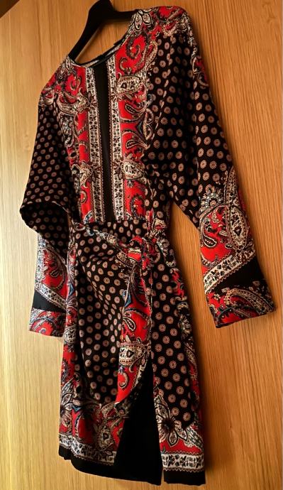 Prodajem predivnu Zara haljinu s jacquard uzorkom u veličini XS (34). Haljina ima kombinaciju crvenih, crnih i bež tonova s dekorativnim uzorkom koji spaja točkice i paisley motive. Kroj je udoban s dugim rukavima i dužinom iznad koljena. Materijal je kvalitetan, a haljina je nova bez etikete.