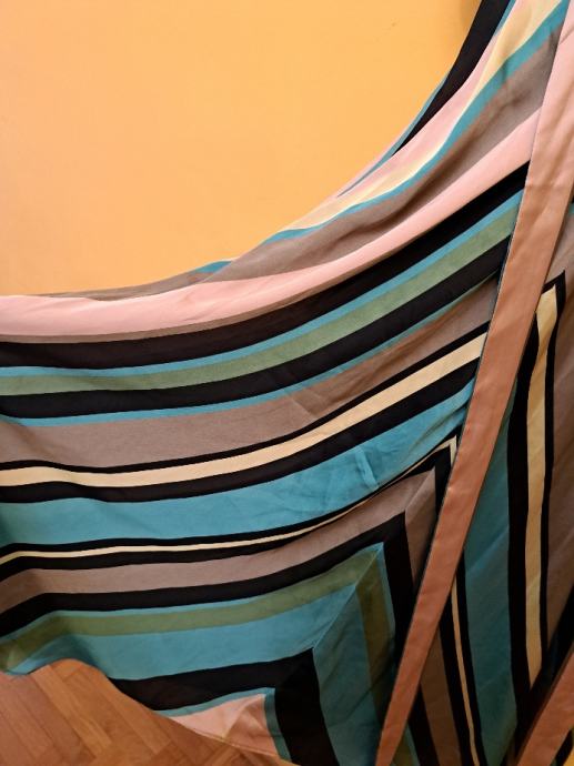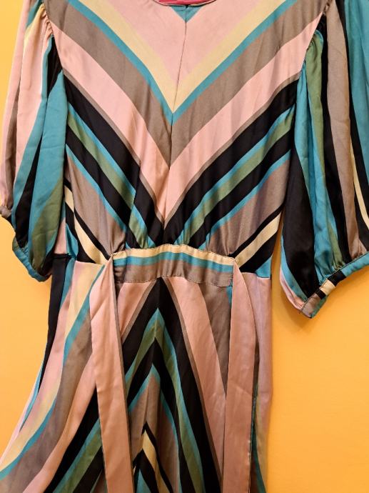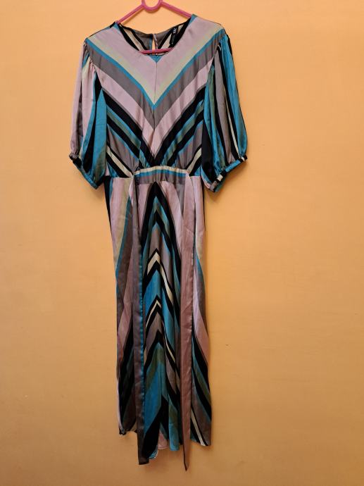 Svecana haljina sa 3/4 rukavima i pojasom koja ide u siroki polukrug. Materijal poput satena. Posebna i neobicno skladnih boja. Nosena jednom prigodom. Velicina L. Pt ukljucen boxnow