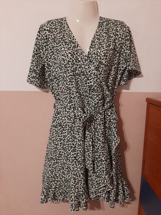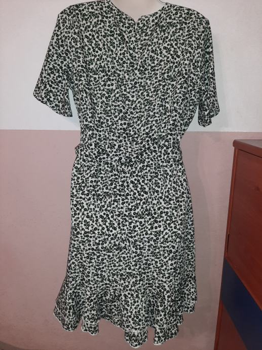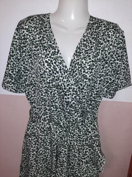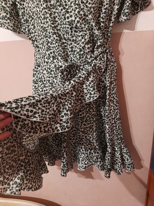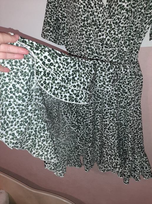 Ženska haljina jednom obućena na sat vremena. Kao nova. Na preklop s volančićima. Mali tamnozeleni cvijetići. Iznad koljena. Vel 36-38