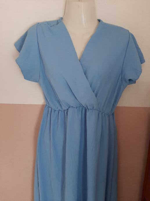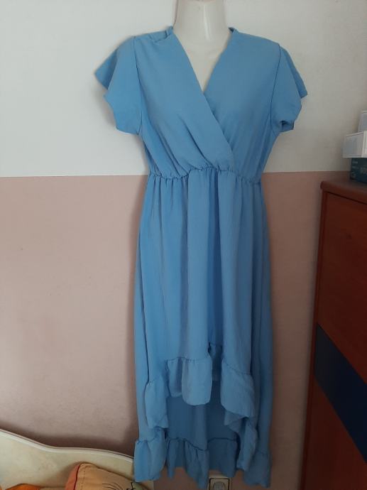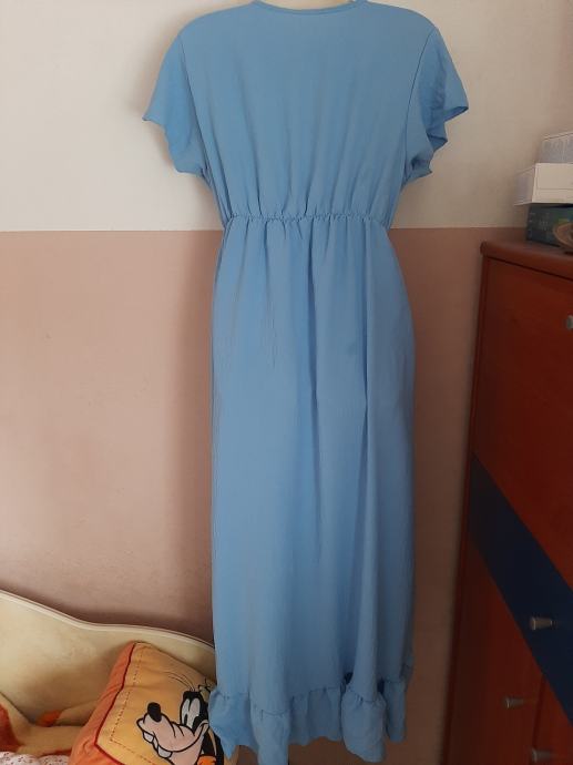 Prekrasna modro-plava ženska haljina s volanom na kraju. Vrlo atraktivna i lijepa. Nikad obučena. Materijal se i rasteže. Vel. 40-42