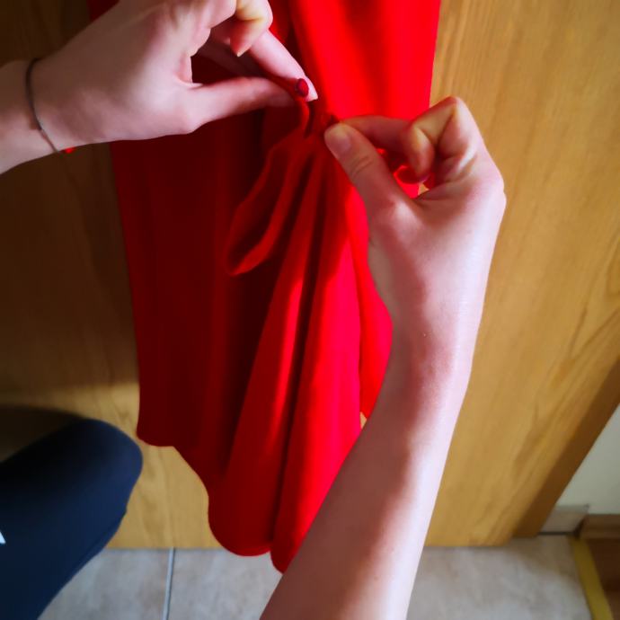 Krojačica mi napravila ušitak dugme da se ne "vuče" po podu i da se ne gazi po njoj. Pa kako ko voli..