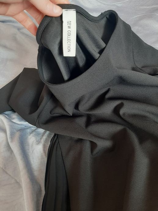 Crna svečana ženska haljina - tunika 3/4 rukava. Nošena svega dva puta. Jako zanimljivog kroja. Sa svake strane od pazuha ide dio koji se širi s plasirao prozirnijeg materijala. Kraća je tako da je idealna za crne pune štrample ili tajice. Vel. 38. Dužina od vrha ramena do dolje 85cm, širina od pazuha do pazuha 46cm