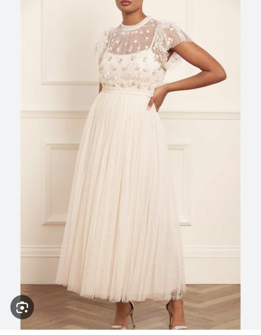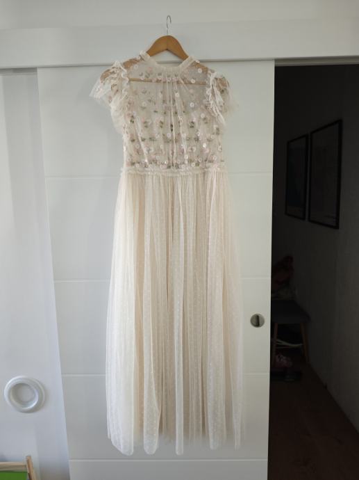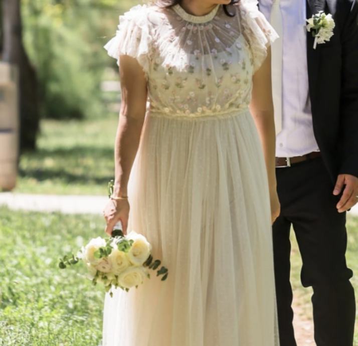 Predivna haljina/vjenčanica veličine 40, nošena jedanput, boje šampanjca. Elegantnog kroja ispod koljena s romantičnim kratkim rukavima i nježnim detaljima. Savršena za intimno vjenčanje / krštenje.