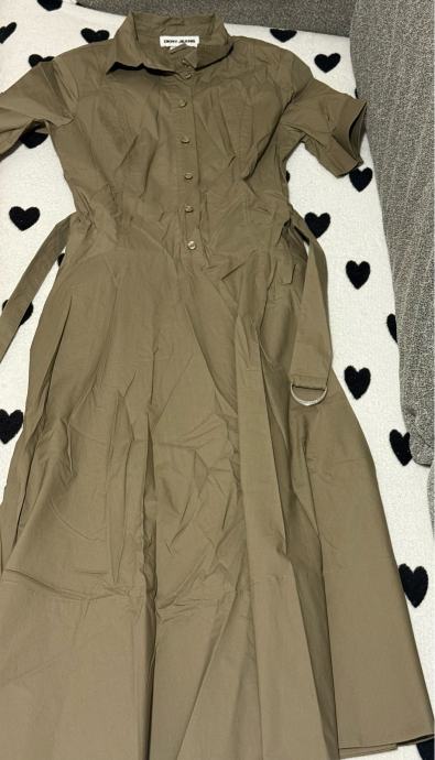 Prodajem zelenu haljinu DKNY Jeans, veličine 34. Haljina je izrađena od pamuka, ima kratke rukave i asimetričnu dužinu. Novo je bez etikete.