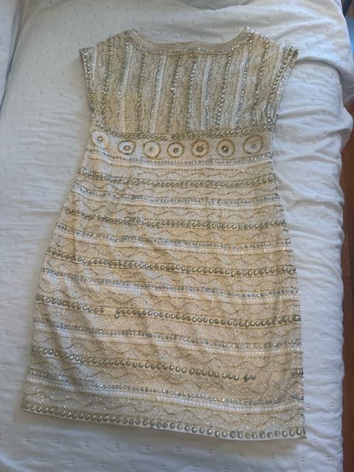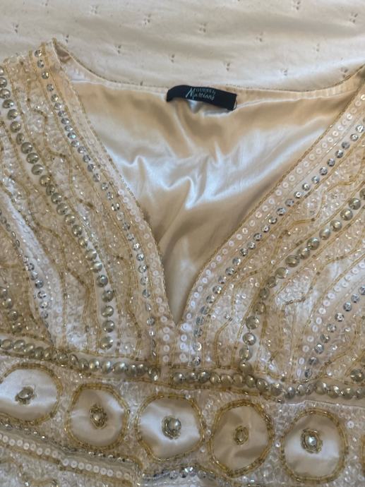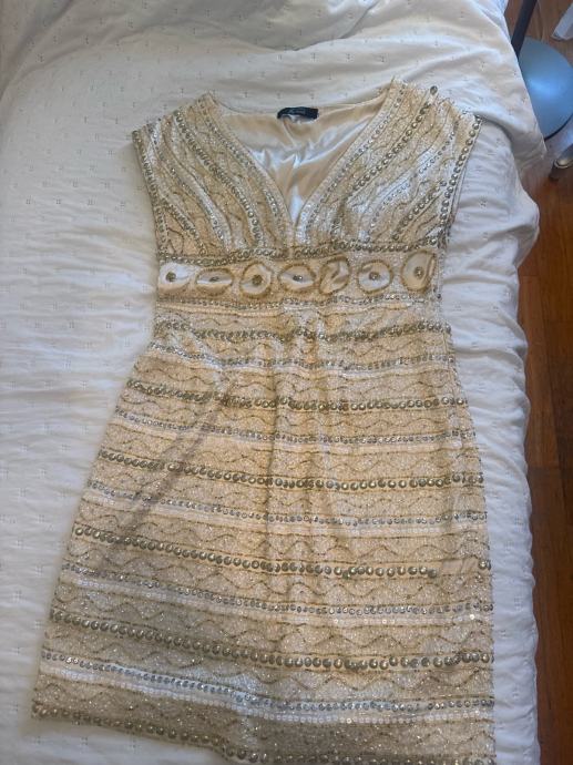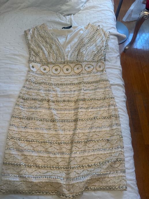Prodajem žensku svečanu haljinu u bež boji, veličine 44. Haljina je izrađena od poliestra, kratkih rukava i dužine iznad koljena. Ukrašena je gustim uzorkom od šljokica, perlica i kamičaka u zlatnim i srebrnim tonovima koji joj daju elegantan i svečan izgled. Dekolte je u obliku slova V, a oko struka se nalazi istaknuti dekorativni pojas s okruglim ukrasnim detaljima. Podstava je u bež boji.