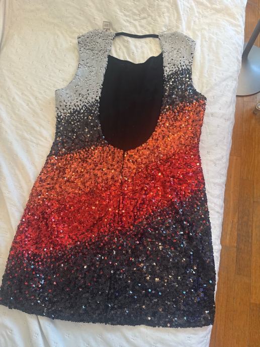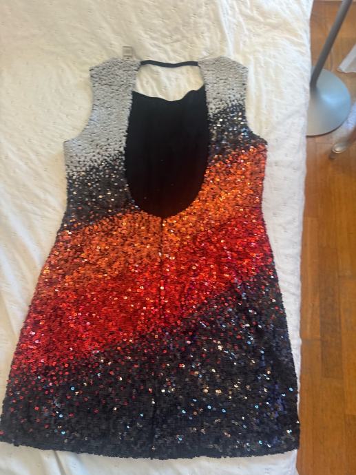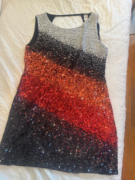 Prodajem žensku svečanu haljinu presvučenu šljokicama u kombinaciji crvene, crne i srebrne boje. Šljokice su raspoređene u dijagonalnom uzorku koji daje zanimljiv vizualni efekt. Haljina je bez naramenica, odnosno bez bretela, s izrezom na leđima, a dužinom seže iznad koljena. Izrađena je od poliestra, veličina 44.
