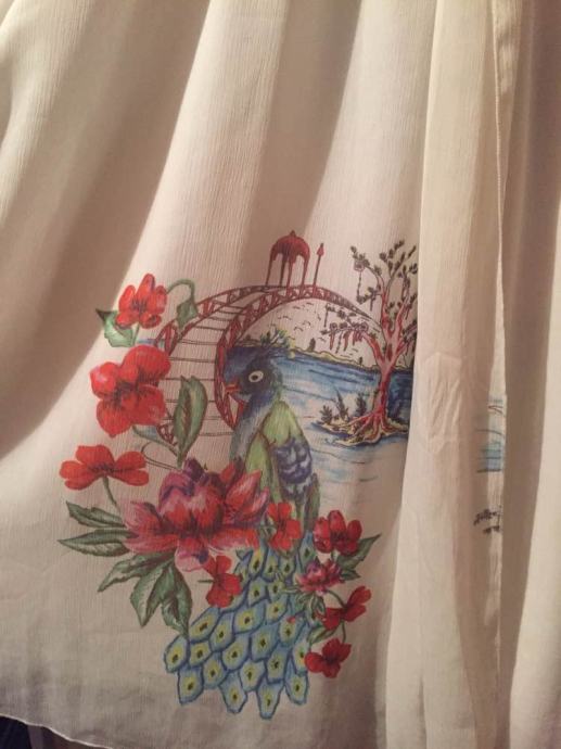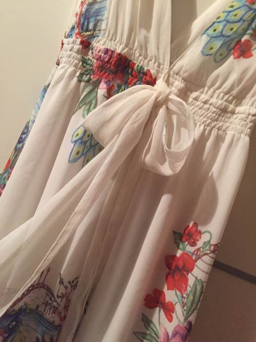 Žoržet bijela lepršava haljina sa tropskim motivom rajskih ptica..sa dugom mašnom na vezivanje..na bretele chanel “čupavog”stila u formi pletenica..ne prozire se..podstavljena..nenošena..vel.M/L...