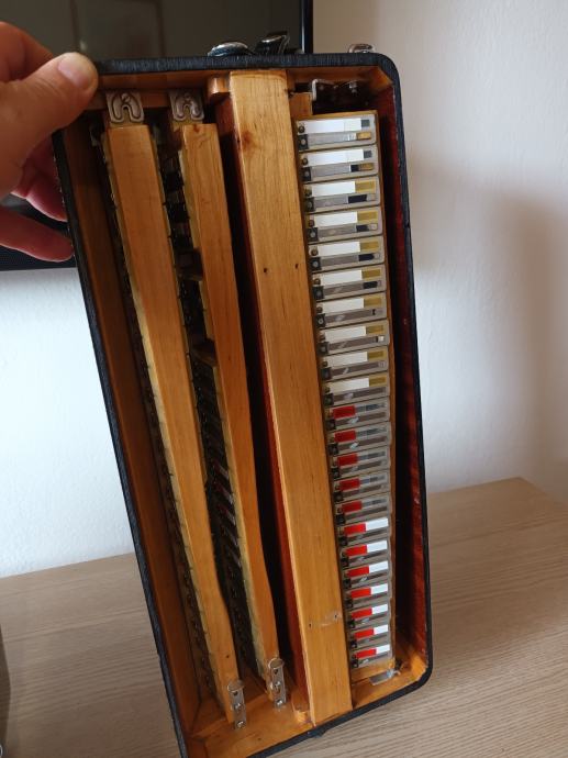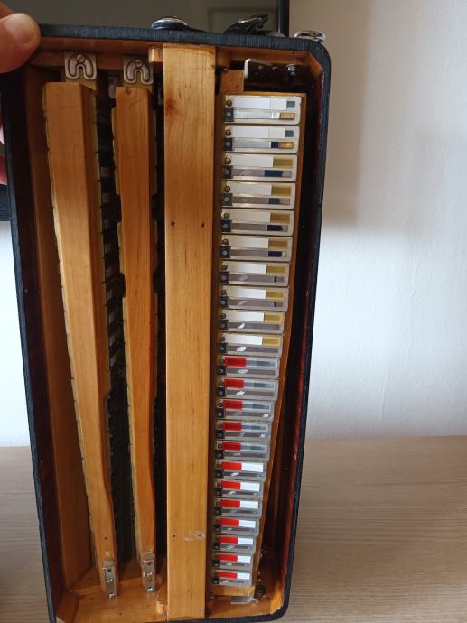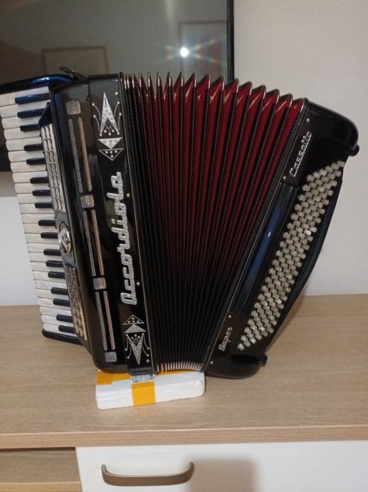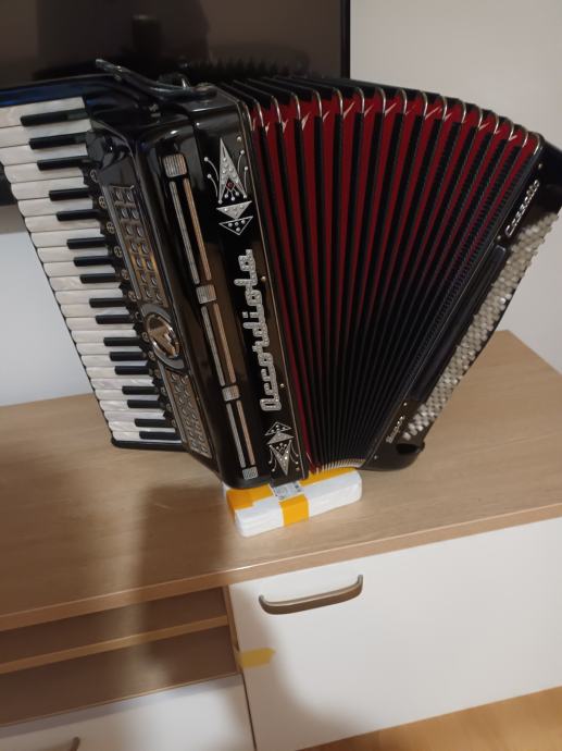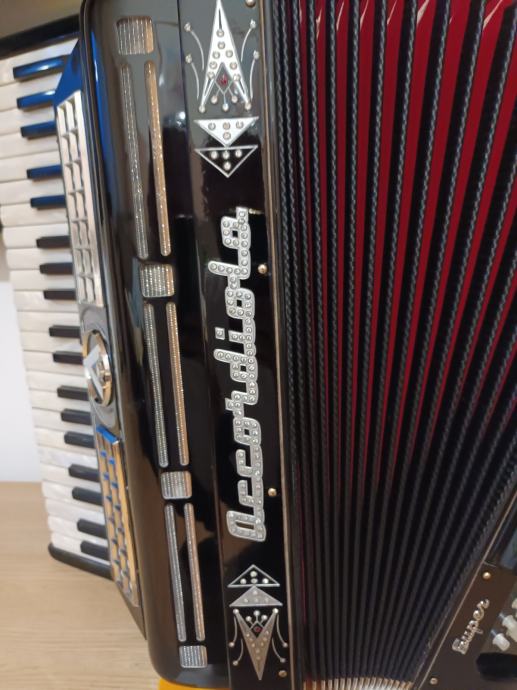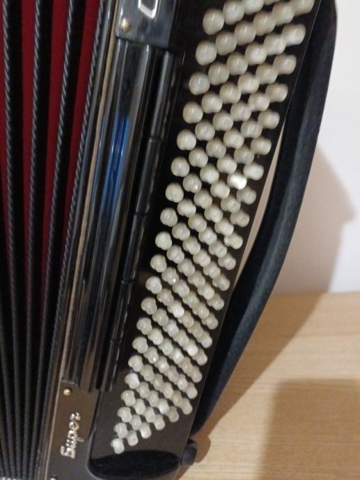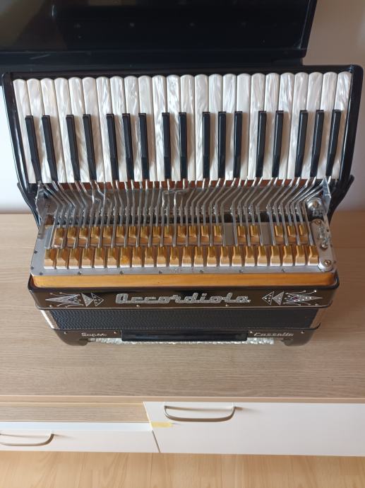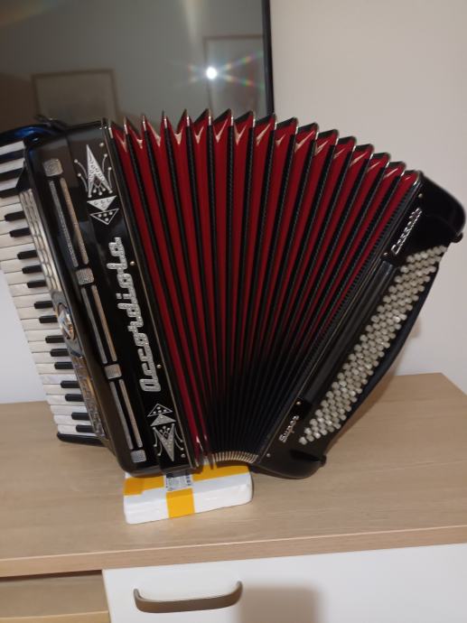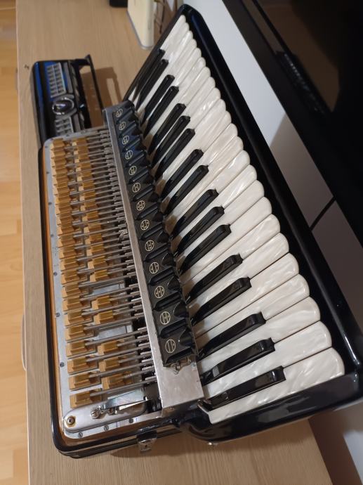 Prodajem unikatnu originalnu talijansku harmoniku.Dupla kabina 2+2+ sordina.Korpus 19,5 cm,težina 10,5 kg,dupla osovina na tipkama.Harmonika je top tonski i tehnički,kao nova.098571714